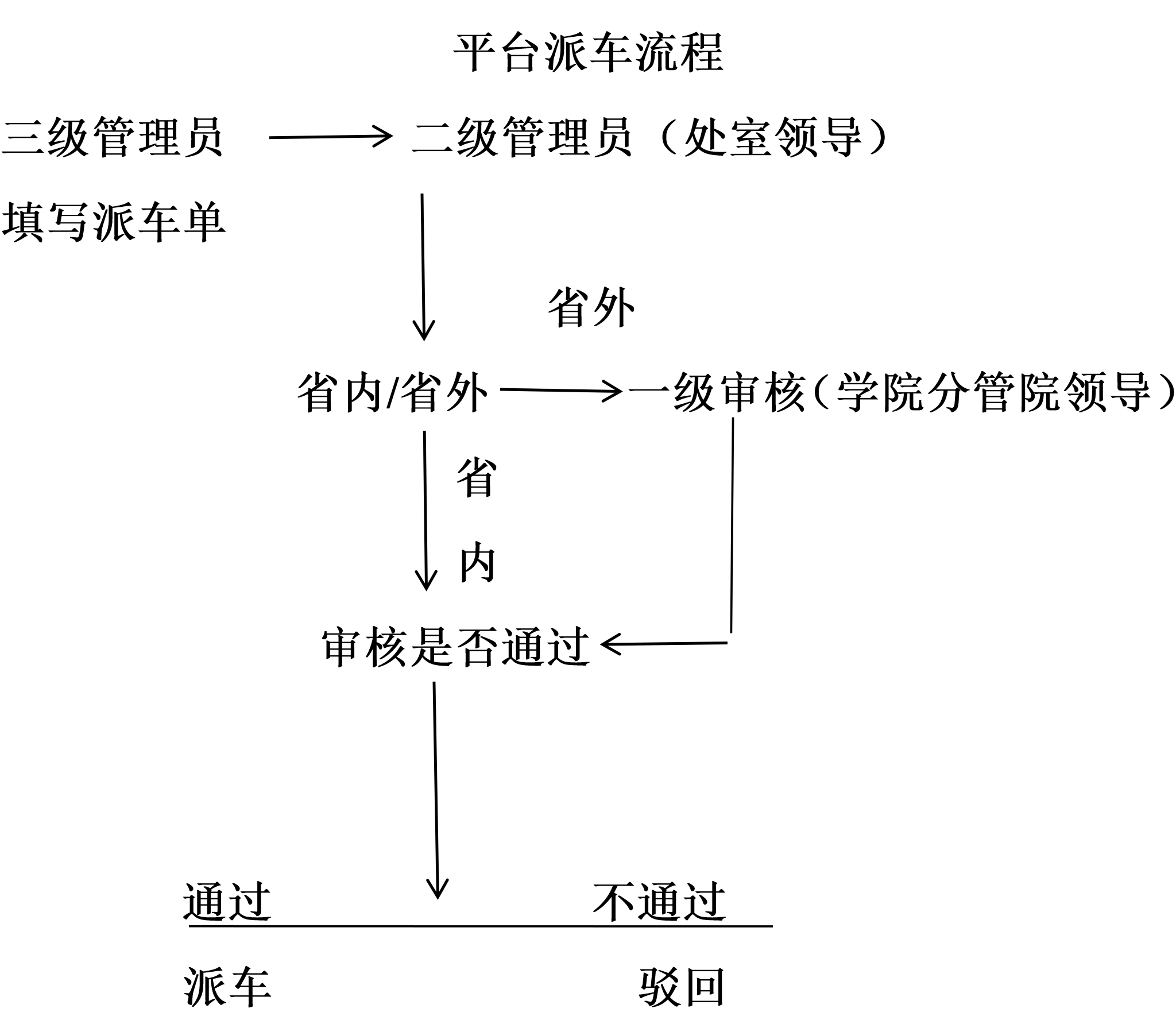 2.严格履行派车程序。各处室负责人根据公务车辆申请适用范围,向学院办公室提出申请,审核通过后,由车管负责人填写派车单,派车单录入河北省公务用车信息管理平台,二级或一级领导审核通过后,打印派车单并盖章后方可派车。