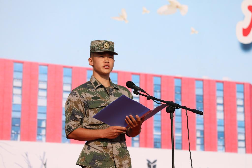 闫庆代表全体承训教官发言表示,将以良好的军人形象、过硬的军事素质完成好军训任务;发扬不怕苦、不怕累的精神,给同学们做出榜样;以兄长之情关心爱护同学们,营造良好的军训和生活氛围。
