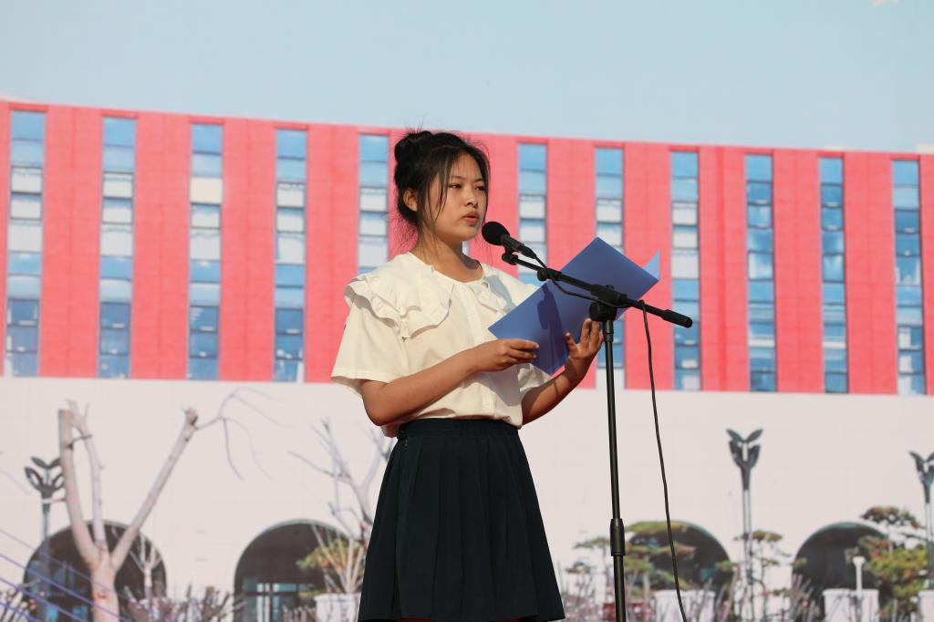 会计系新生刘芷言代表全体新同学表态,一切行动听指挥,服从管理,努力完成军训任务,学习教官们的好思想、好作风、好品德,用坚毅、刻苦、诚实、勇敢、勤劳,留下在beat365中文官方网站的奋斗足迹。