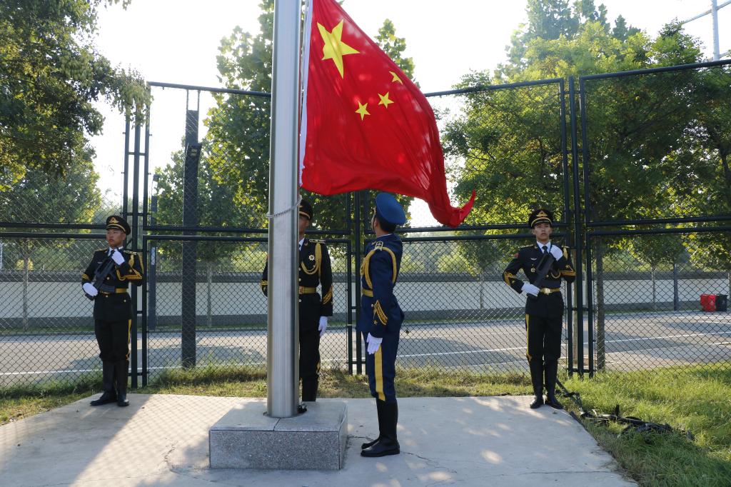 英姿飒爽的国旗护卫队,迈着整齐矫健的步伐走来。伴随着庄严雄壮的国歌声,五星红旗冉冉升起,迎风飘扬。