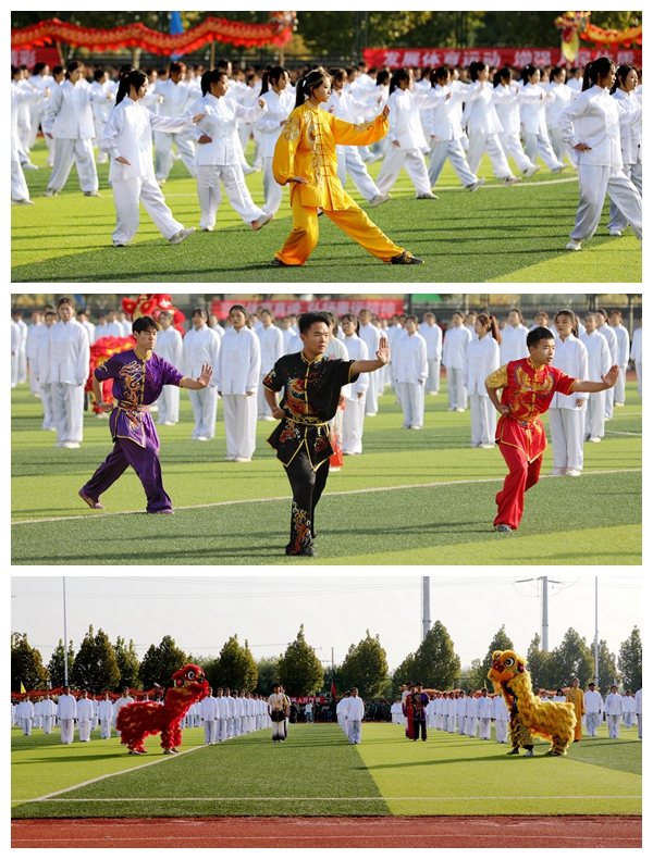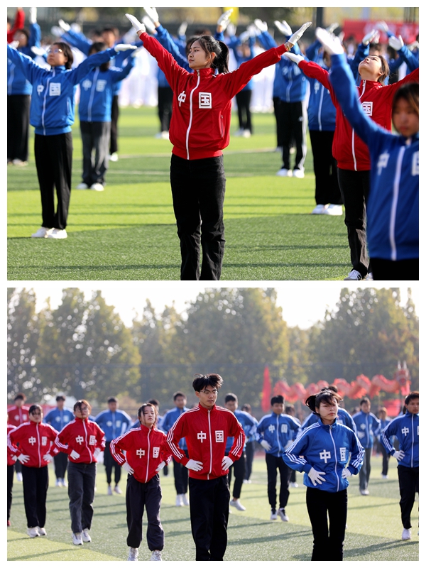 精彩的文艺表演将运动会开幕式推向高潮。376名表演者身着靓丽的运动装,奔向绿茵场,尽情绽放着激情和活力,宛若彩色的海洋,用蓝红相间的形式呈现出“信工”的字样。太极拳方队将舞狮、舞龙和武术、太极拳有机融合,时而昂首阔步,时而腾空而跃,刚柔相济,动静交错,将传统艺术的独特魅力与中华武术的博大精深展现得淋漓尽致。军体拳表演动作精炼,节奏明快,一招一式,虎虎生风,步步有力。整场表演掌声阵阵,满堂喝彩,意犹未尽。