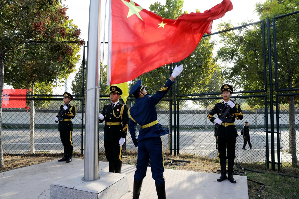 伴着庄严的《义勇军进行曲》,全场肃立,向冉冉升起的国旗行注目礼,鲜艳的五星红旗迎风招展。