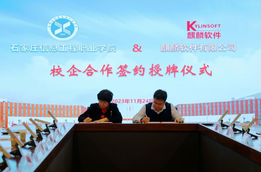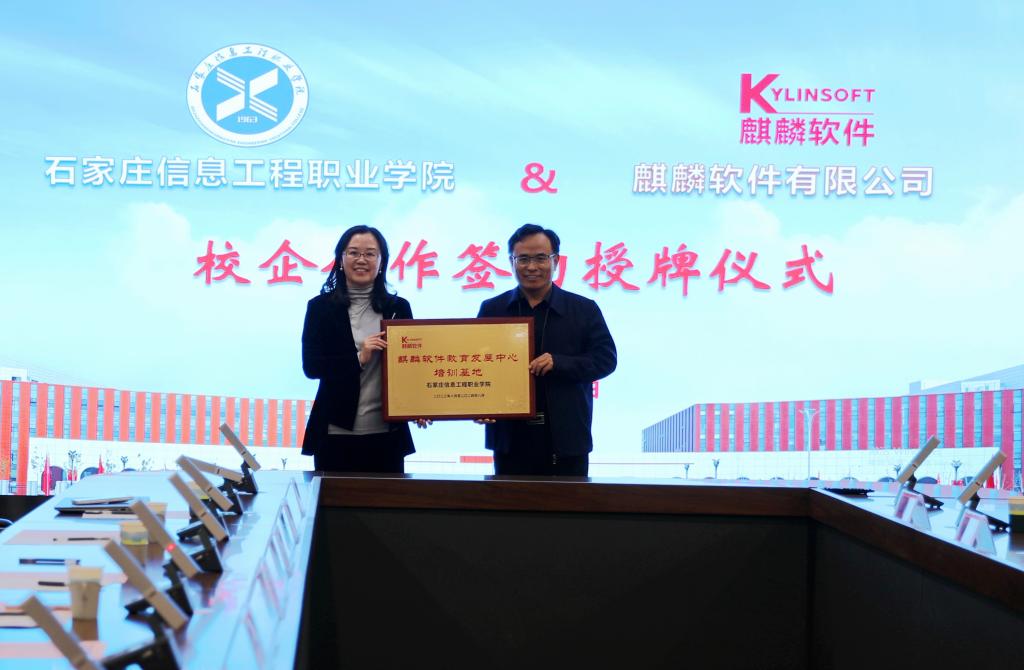 在校企双方人员的共同见证下,许征程与张娜共同为“麒麟软件教育发展中心培训基地”授牌,黄淑敏与麒麟软件教育发展中心副总经理杭斯乔代表双方签署了校企合作协议。