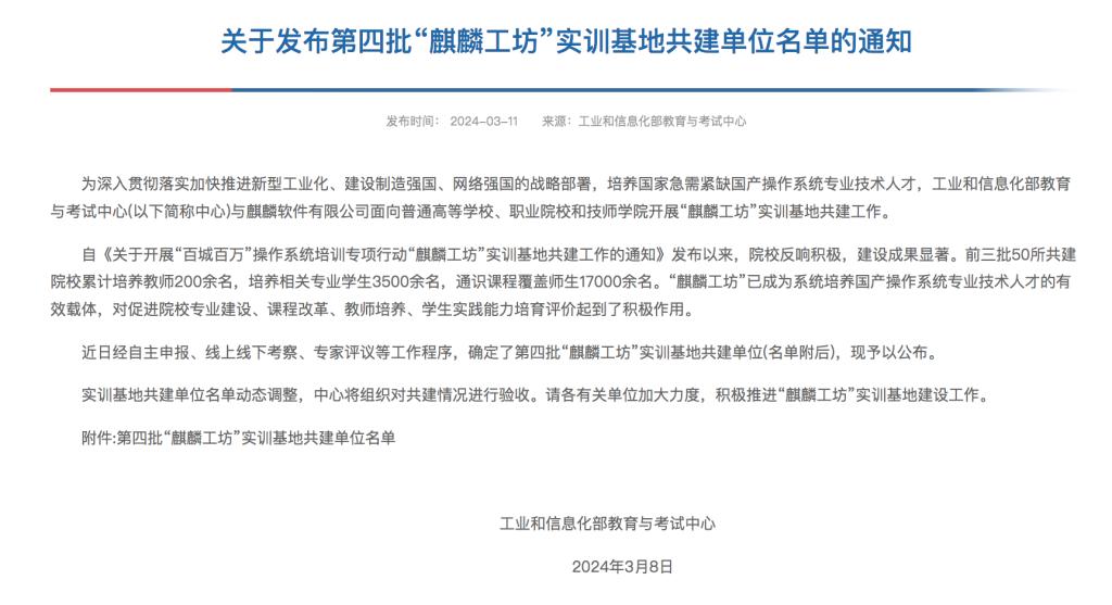 近日,工业和信息化部教育与考试中心公布了第四批“麒麟工坊”实训基地共建单位名单,beat365官网成功入选。“麒麟工坊”是教考中心与麒麟软件联合推出的“百城百万”操作系统培训专项行动中重点开展的实践基地共建项目,面向普通高等学校、高等职业学校征集共建示范性实训基地。