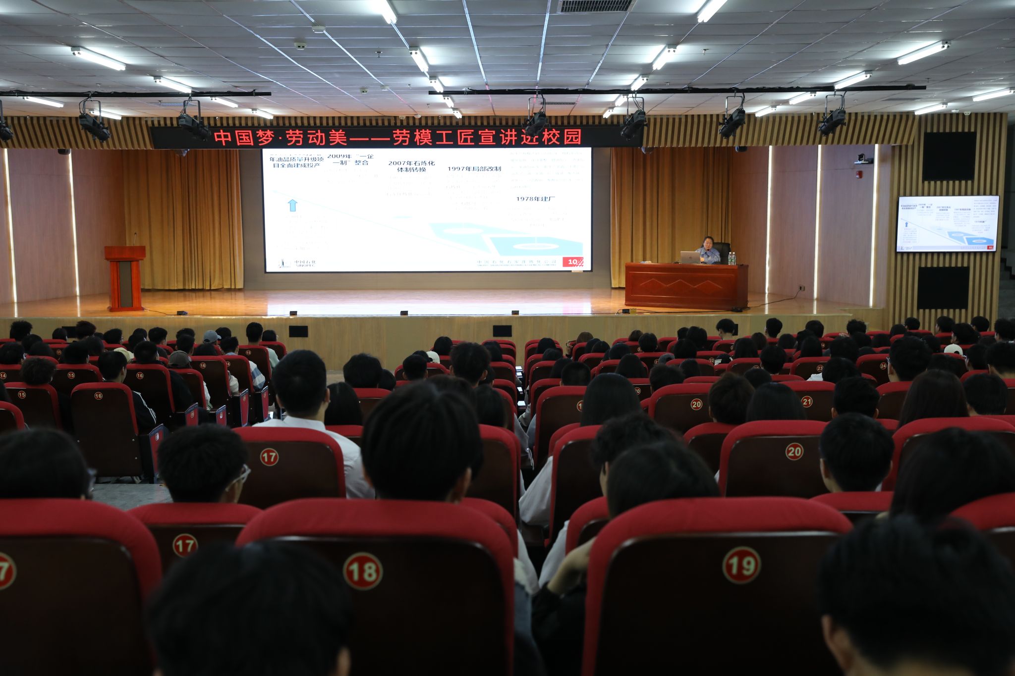 活动现场邀请获得河北省劳动模范、河北省五一劳动奖章、河北省突出贡献技师、河北省能工巧匠等荣誉称号,享受国务院特殊津贴的中国石油化工股份有限公司石家庄炼化分公司催化重整装置首席技师石晓棠老师以《永不停止的攀登》为题,结合自身的工作经历,生动讲述了自己的成长故事,让师生领略大国工匠风采,感受劳模工匠精神。