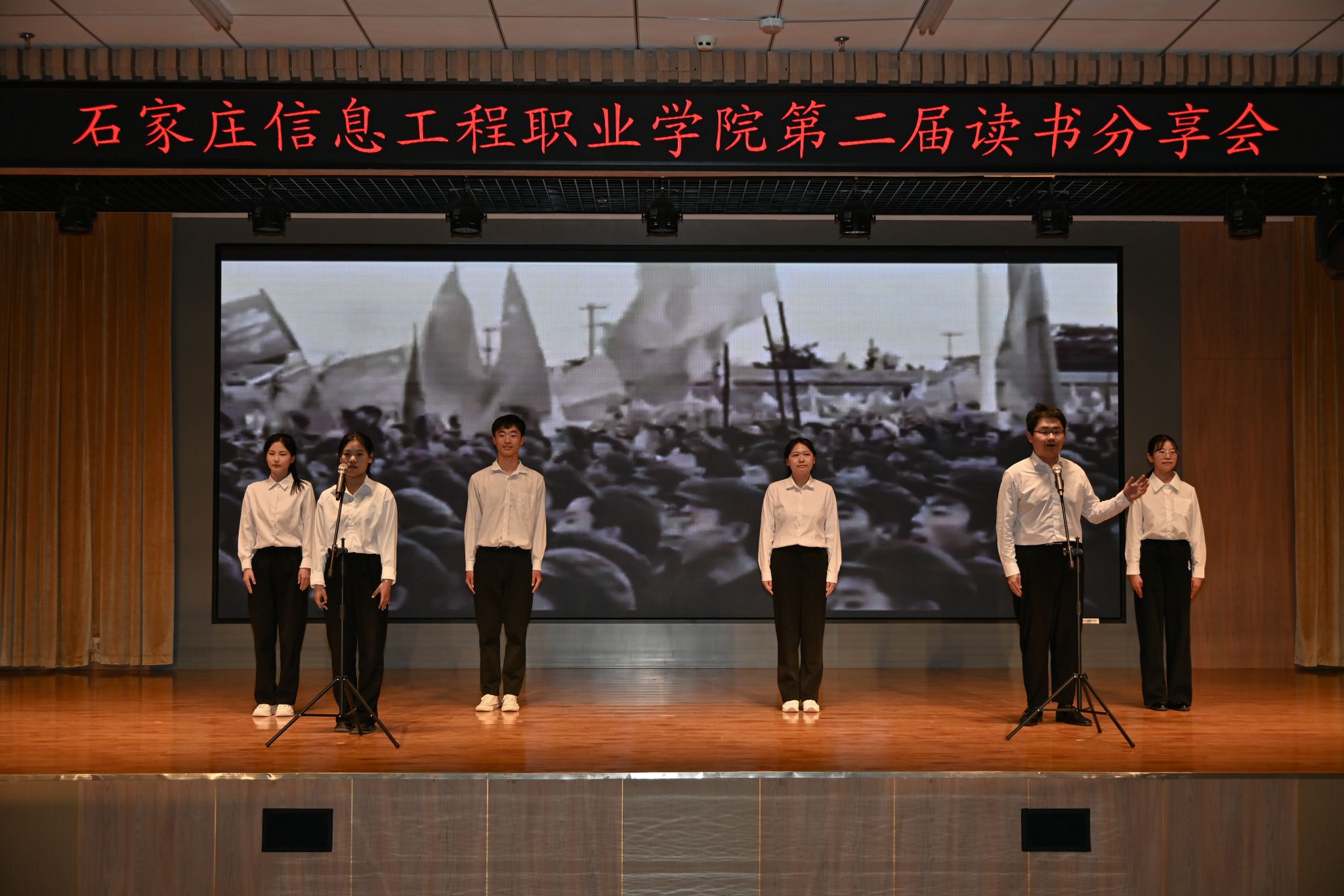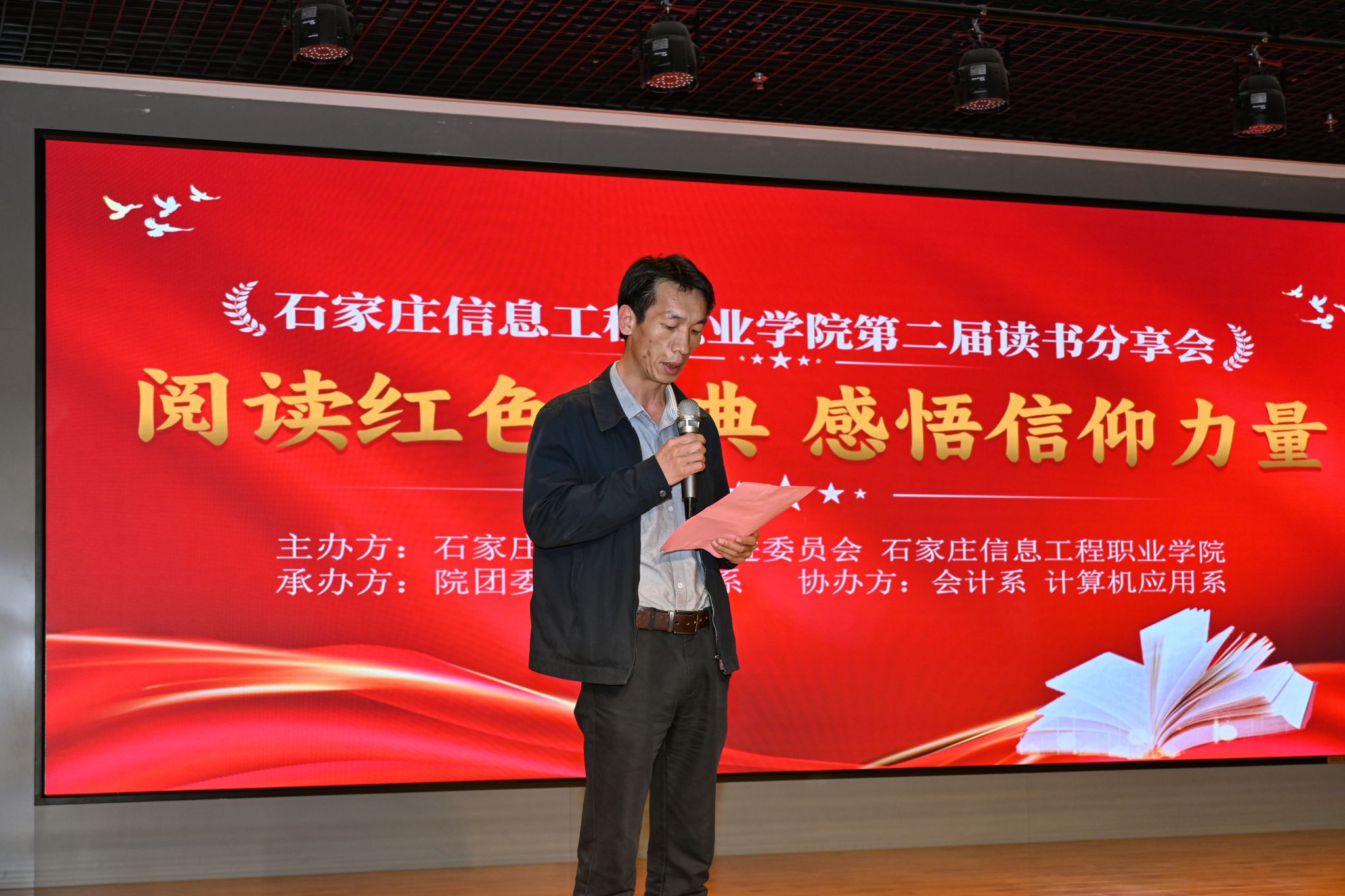 最美人间四“阅”天,正是青春读书时。在这个万物生长的季节,我们迎来第29个“世界读书日”。为进一步引导广大青年爱读书、读好书、善读书,营造校园浓郁的读书氛围,进一步激发学生的读书热情,4月24日,由beat365官网和石家庄市全民阅读促进委员会主办,学院团委与传媒艺术系承办,会计系与计算机应用系协办的“阅读红色经典 感悟信仰力量”第二届读书分享会在图书馆一楼报告厅举办。学院学生处处长、院团委书记展庆召,河北省社区服务促进会副会长王雷东出席。