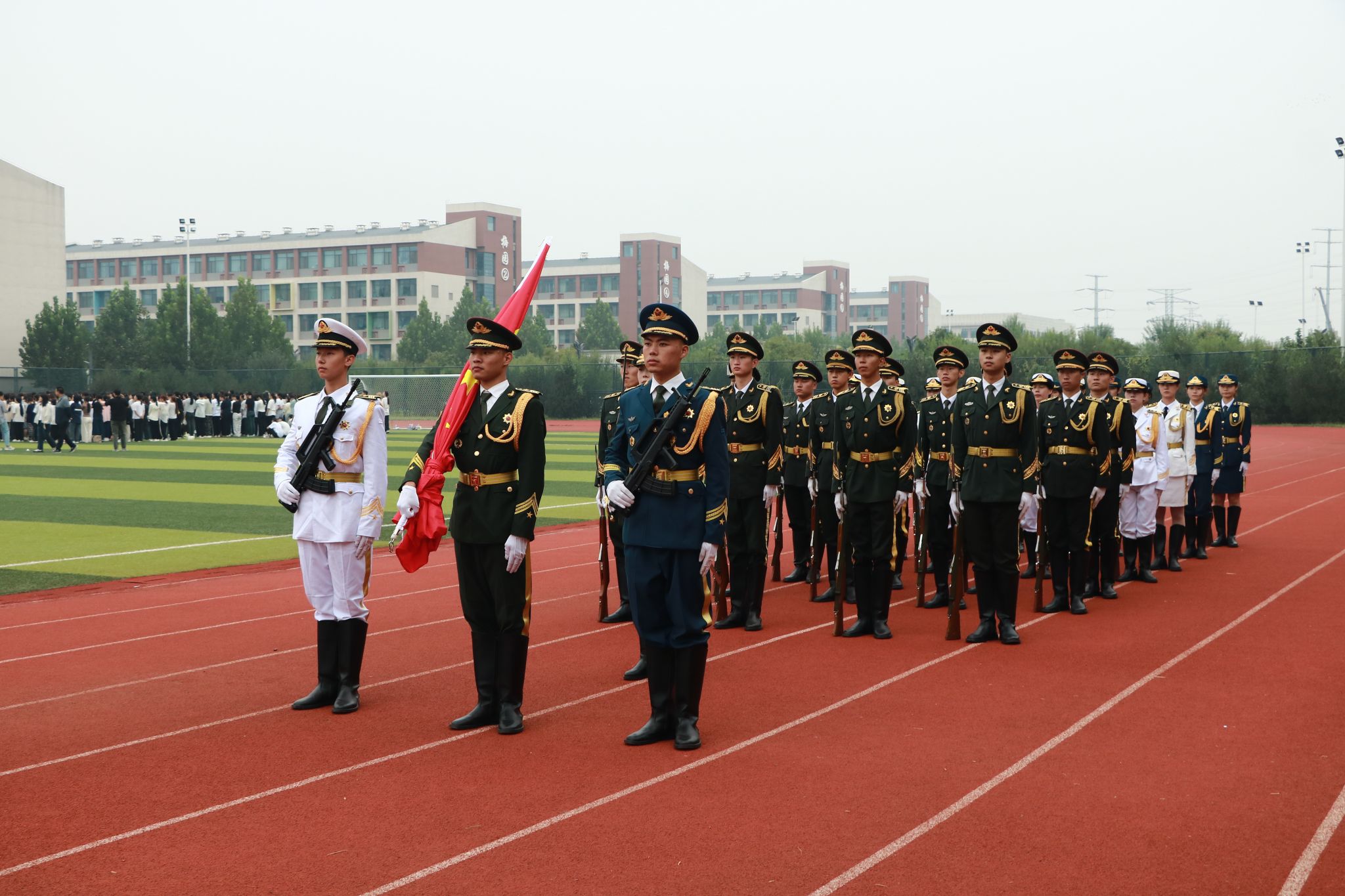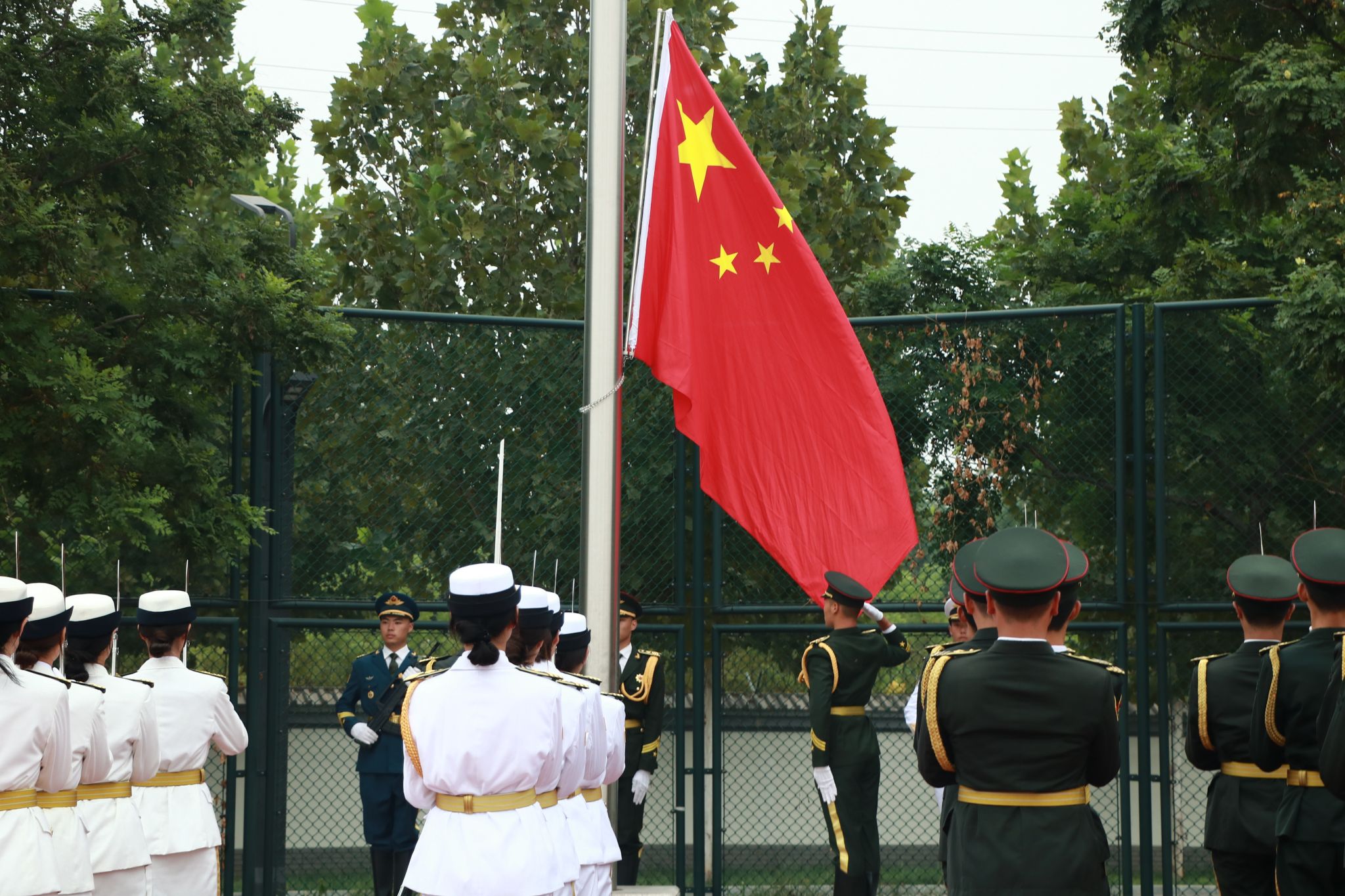 伴随着铿锵有力的脚步声,国旗护卫队迈着整齐的步伐,护卫着五星红旗入场。国歌激昂,五星红旗冉冉升起,迎风飘扬。