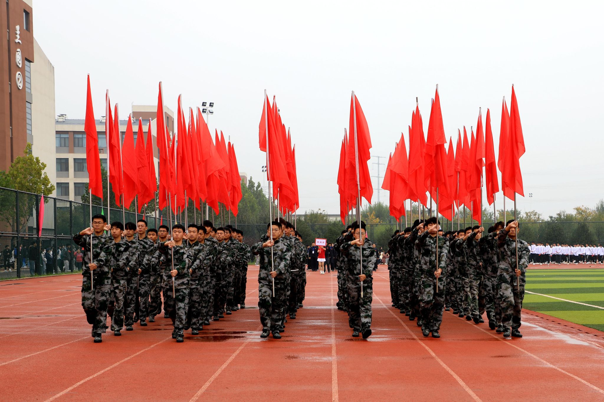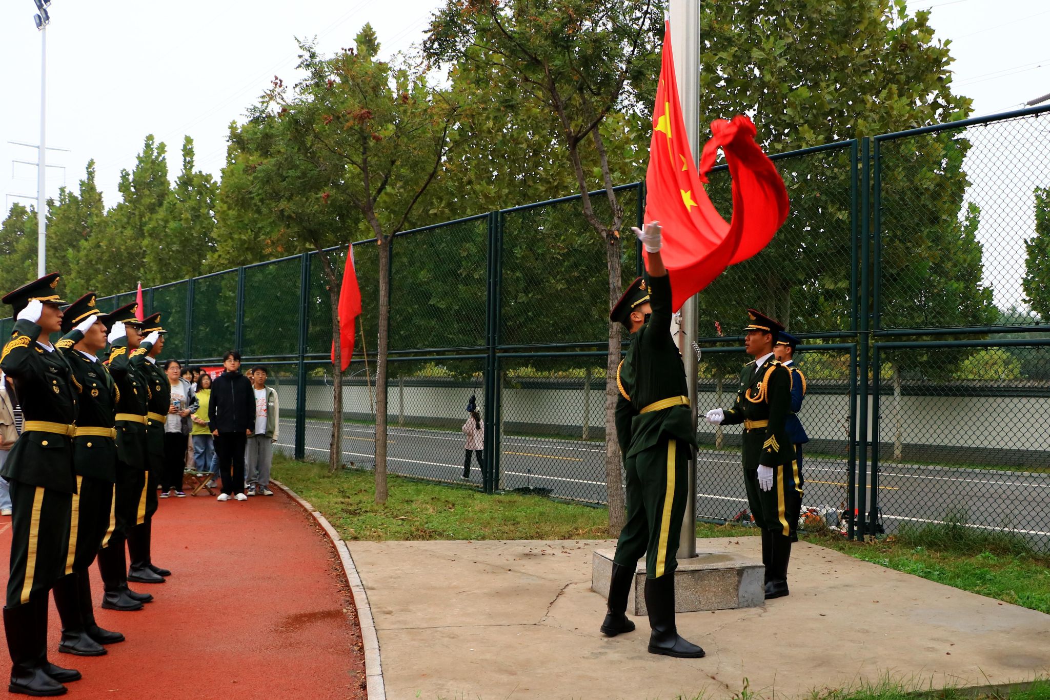 伴着庄严的《义勇军进行曲》,全场起立,行注目礼,鲜艳的五星红旗冉冉升起,随风飘扬。