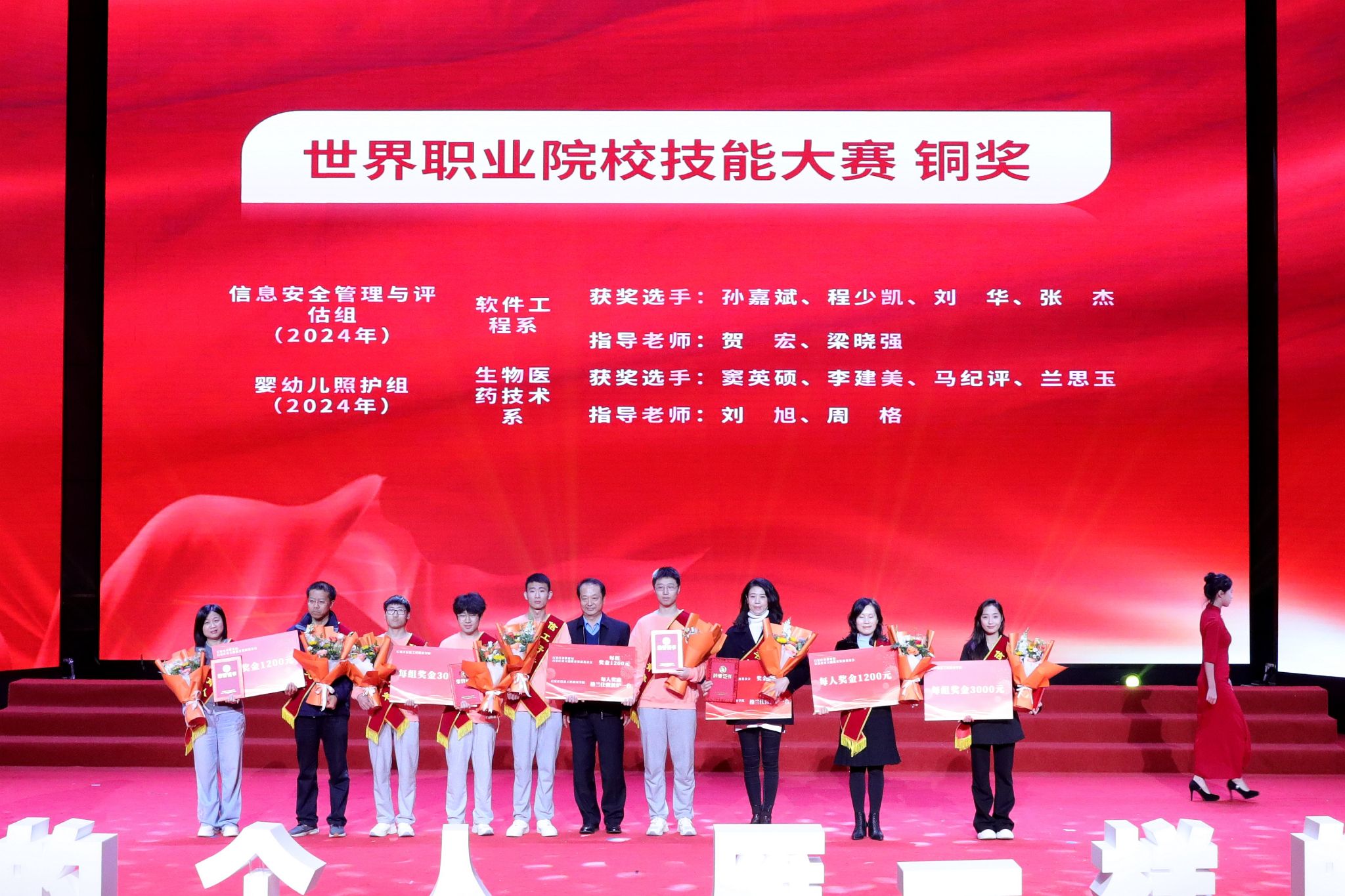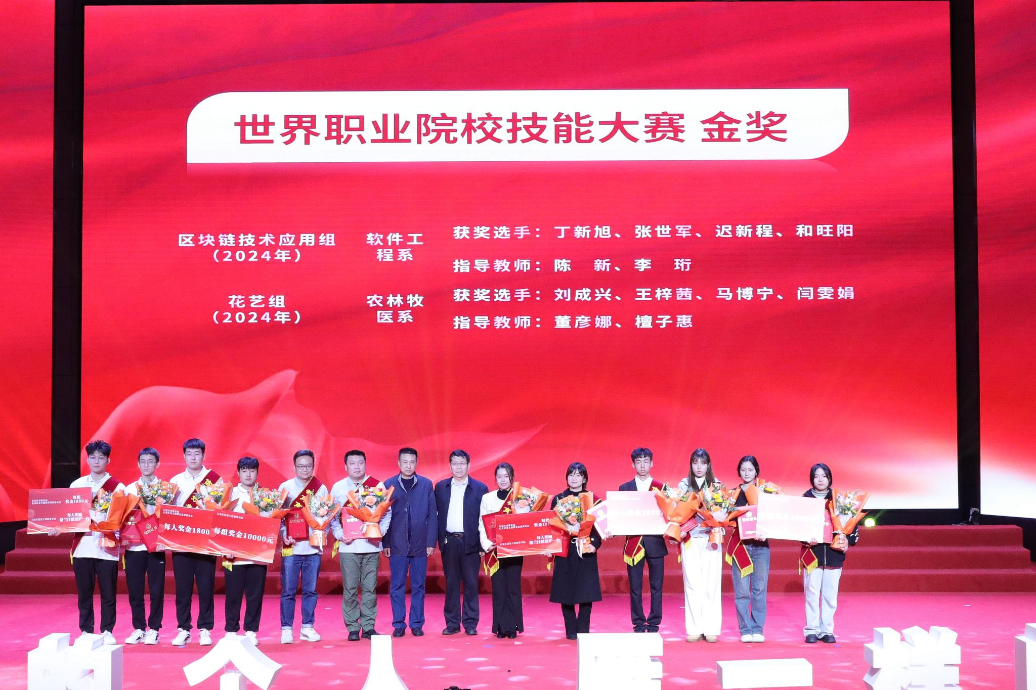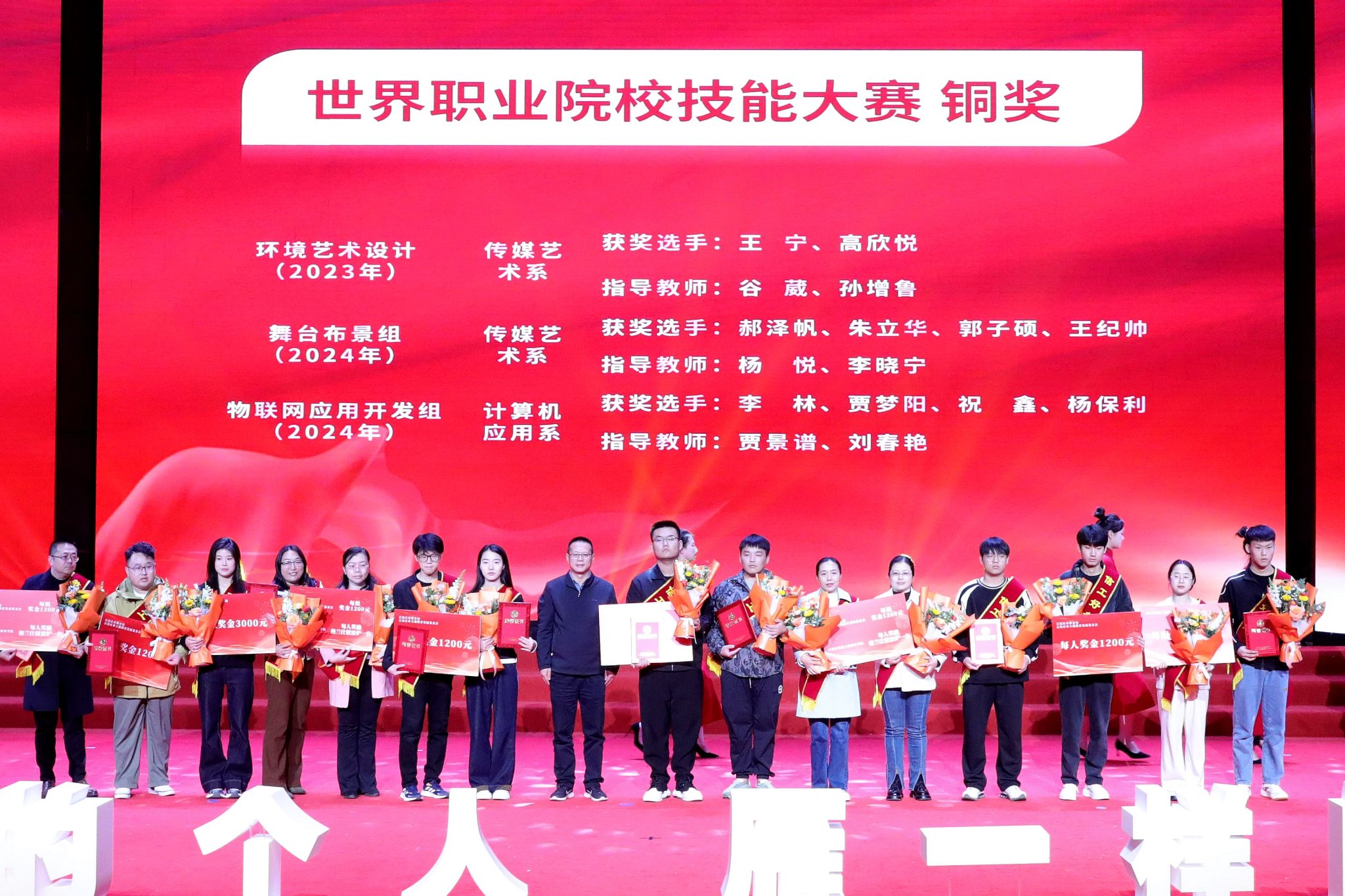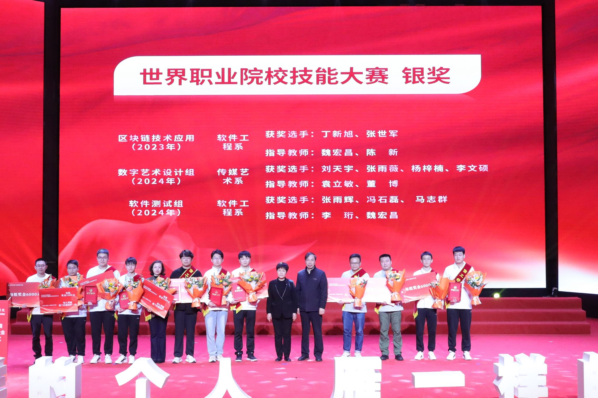 大会宣读了《中共beat365中文官方网站委员会关于表彰2023年全国职业院校技能大赛和2024年世界职业院校技能大赛获奖学生、指导教师和优秀组织部门的决定》。决定授予在职业院校技能大赛国赛中获奖的33名学生“信工好青年”荣誉称号。授予获得金奖团队的4名指导教师“教书育人楷模”荣誉称号;授予获得银奖团队的3名指导教师“教书育人模范”荣誉称号;授予获得铜奖团队的10名指导教师“教书育人先进”荣誉称号。授予在大赛组织中做出突出贡献的教务处、软件工程系、农林牧医系、传媒艺术系、计算机应用系、生物医药技术系6个部门“优秀组织奖”。