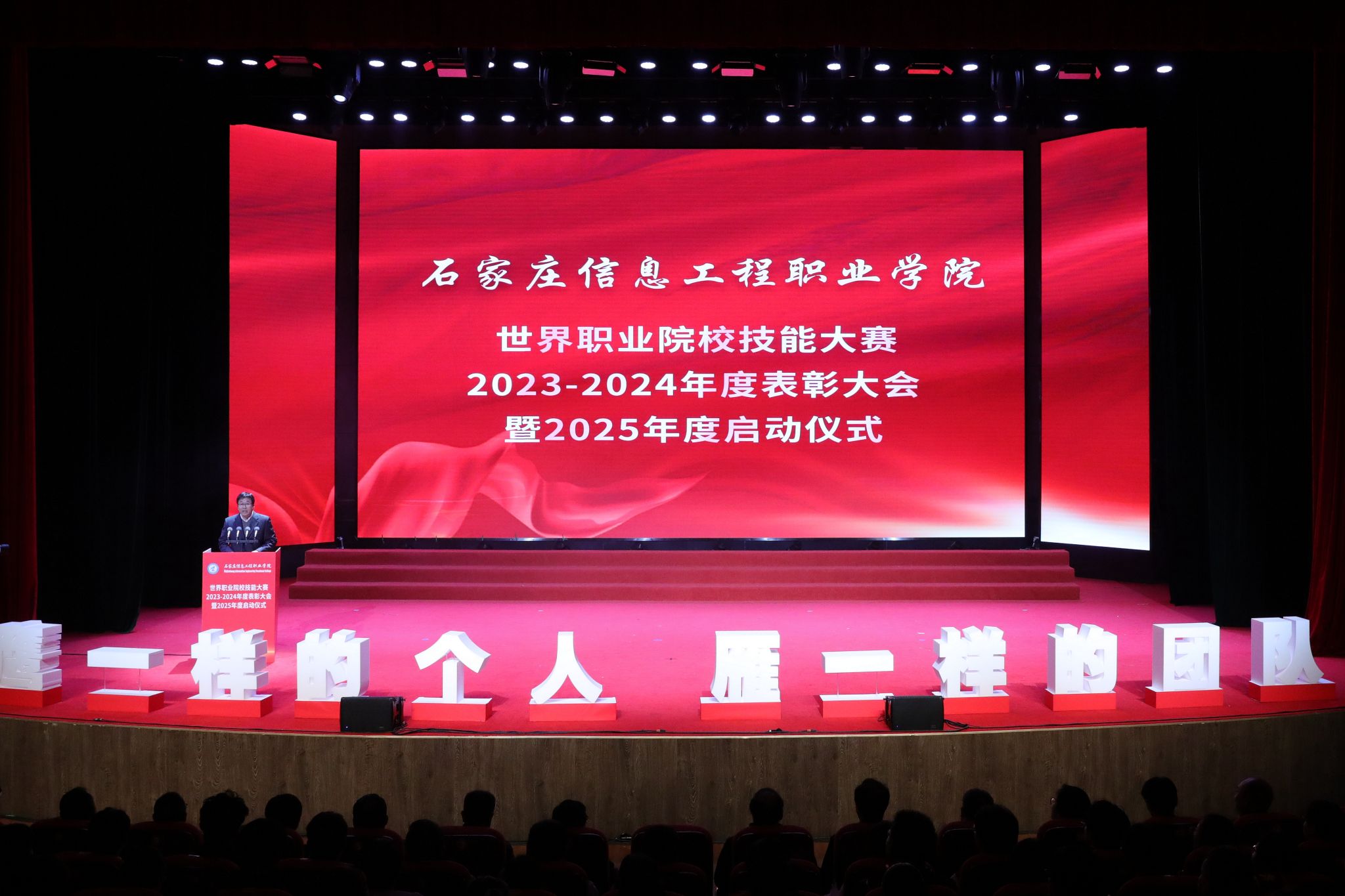 为表彰先进,树立典型,进一步激发全院师生的积极性和创造性,11月14日下午,学院在昭德礼堂隆重举行世界职业院校技能大赛2023—2024年度表彰大会暨2025年度启动仪式。院长许征程出席并讲话。石家庄市立德教育发展基金会秘书长张建英出席并颁奖。党委副书记马福恒主持。学院领导赵伟、刘占红、赵惠娟,党委委员王志明、范成宝参加。