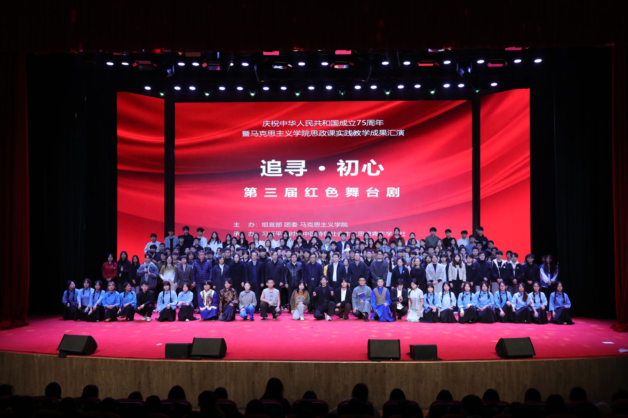 11月14日晚,昭徳礼堂,星光璀璨。庆祝中华人民共和国成立75周年暨马克思主义学院思政课实践教学成果汇演《追寻·初心》第三届红色舞台剧隆重上演。学院领导许征程、马福恒、赵伟、刘占红、赵惠娟、王志明、范成宝与广大师生一同现场观看演出。
