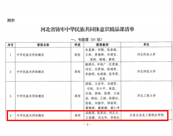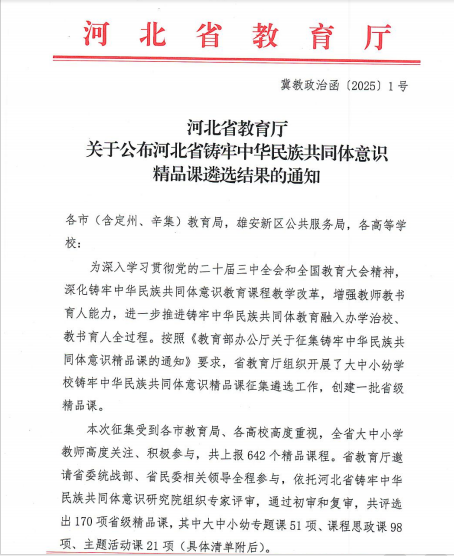 近日,按照《教育部办公厅关于征集铸牢中华民族共同体意识精品课的通知》要求,河北省教育厅组织开展铸牢中华民族共同体意识精品课征集遴选,创建一批省级精品课,beat365官网马克思主义学院选送的《中华民族共同体概论》专题课成功入选河北省省级精品课。