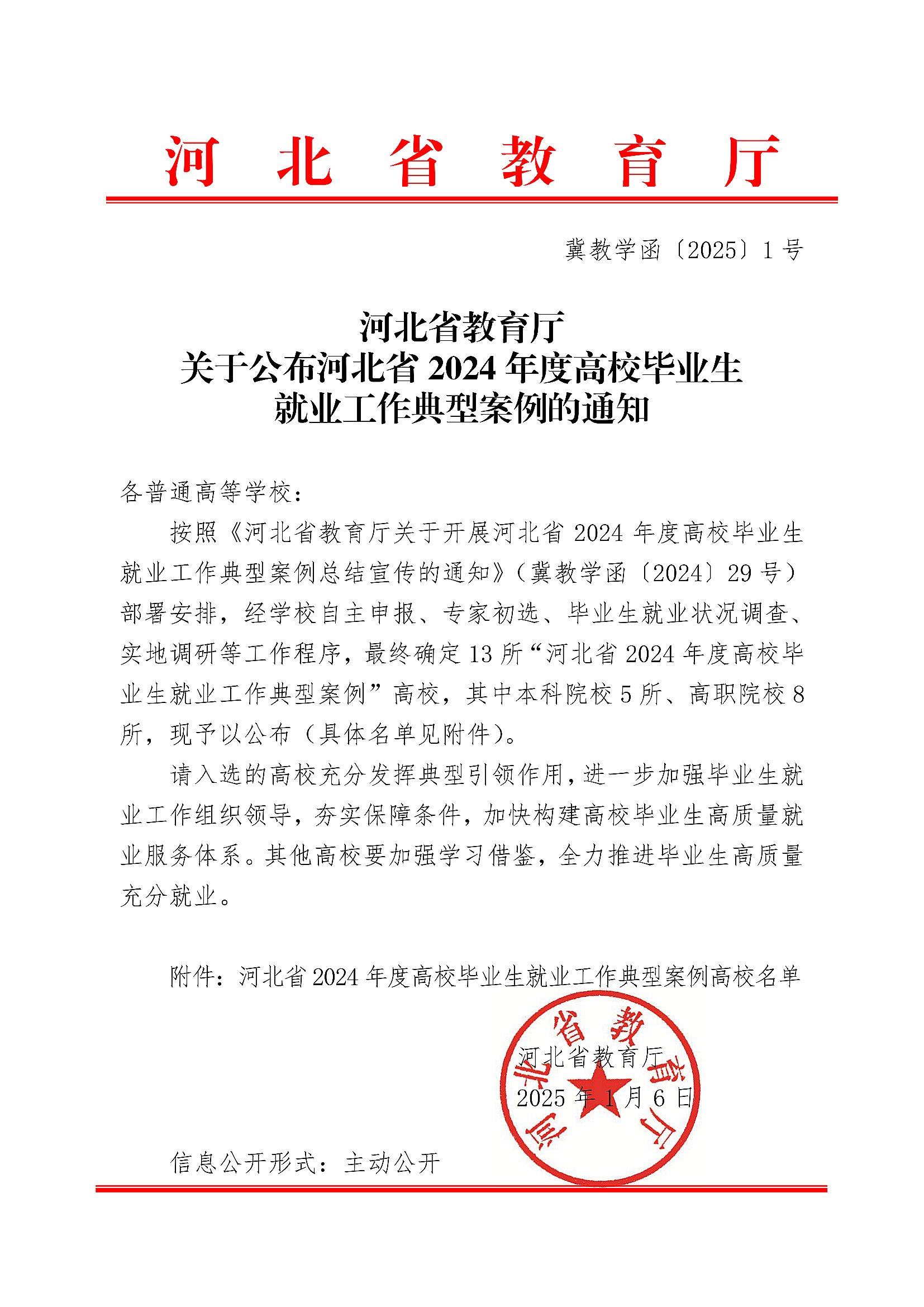 1月6日,河北省教育厅公布2024年度毕业生就业创业工作典型案例高校名单,beat365官网成功获评“河北省2024年度毕业生就业工作典型案例”高校。