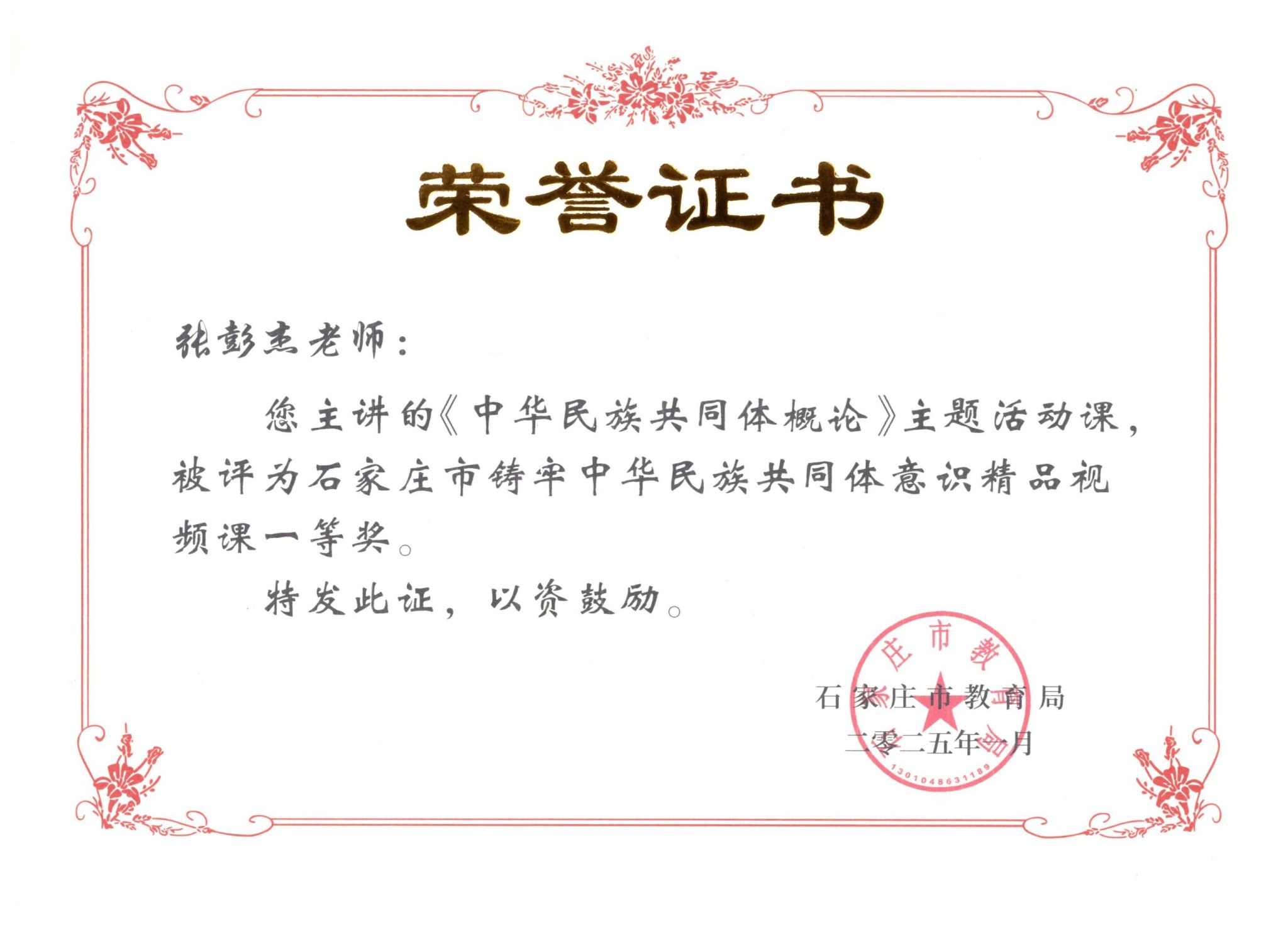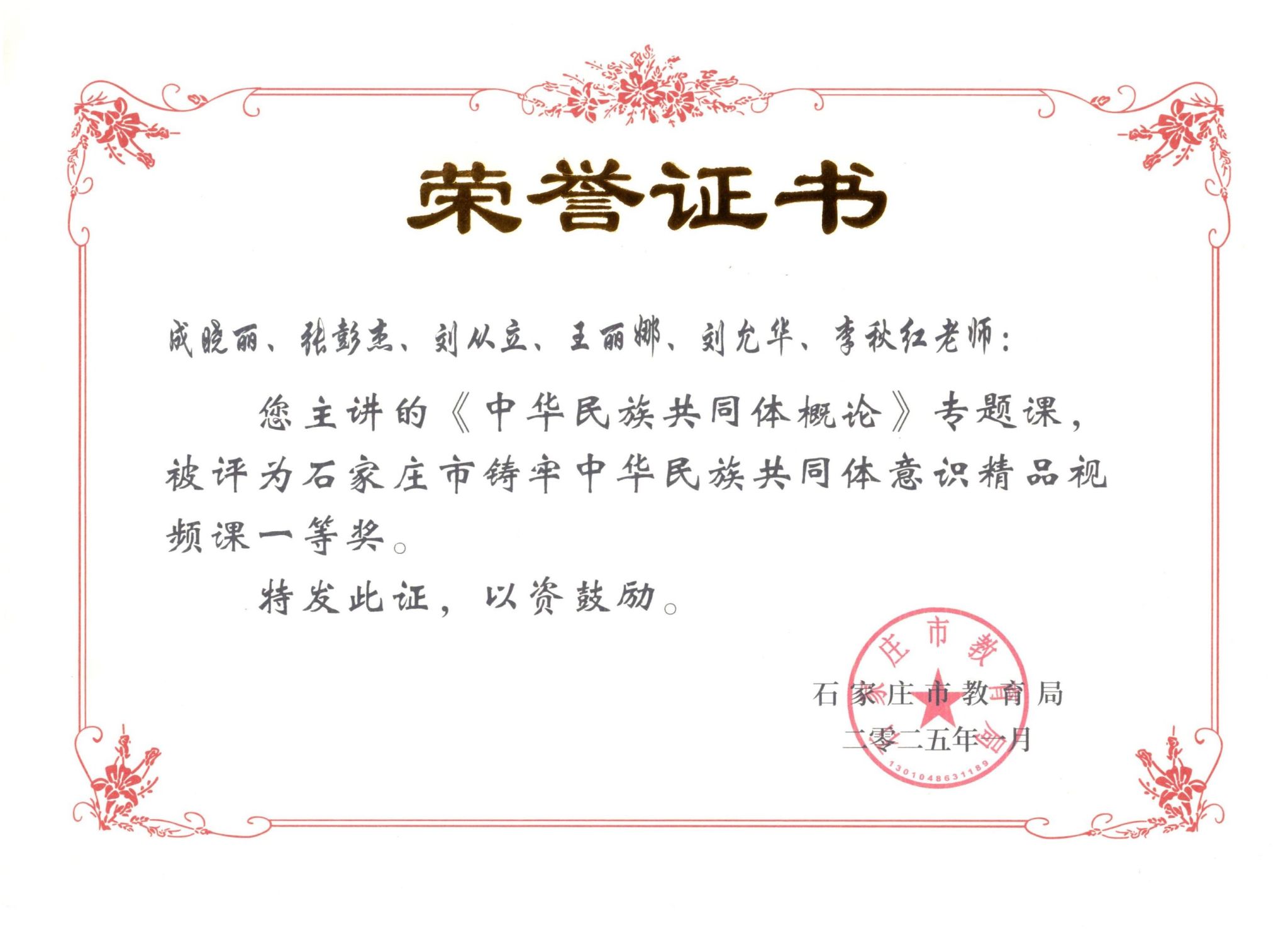 近日,按照《教育部办公厅关于征集铸牢中华民族共同体意识精品课的通知》和《省教育厅关于征集铸牢中华民族共同体意识精品课的通知》(冀教政治函〔2024〕13号)要求,石家庄市教育局组织开展全市铸牢中华民族共同体意识精品课征集遴选工作。beat365官网马克思主义学院选送的《中华民族共同体概论》专题课、《中华民族共同体概论》主题活动课成功入选石家庄市铸牢中华民族共同体意识精品视频课一等奖。