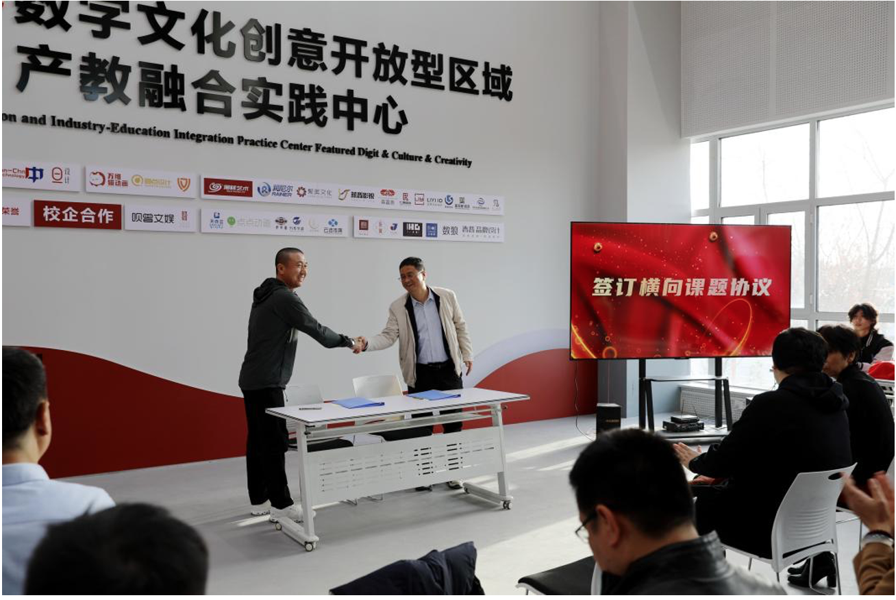 学院科研处负责人和石家庄万维猫科技有限责任公司总经理袁大鹏签订《洪易传》动作捕捉一期横向课题协议,进一步深化了双方在科研项目上的合作。