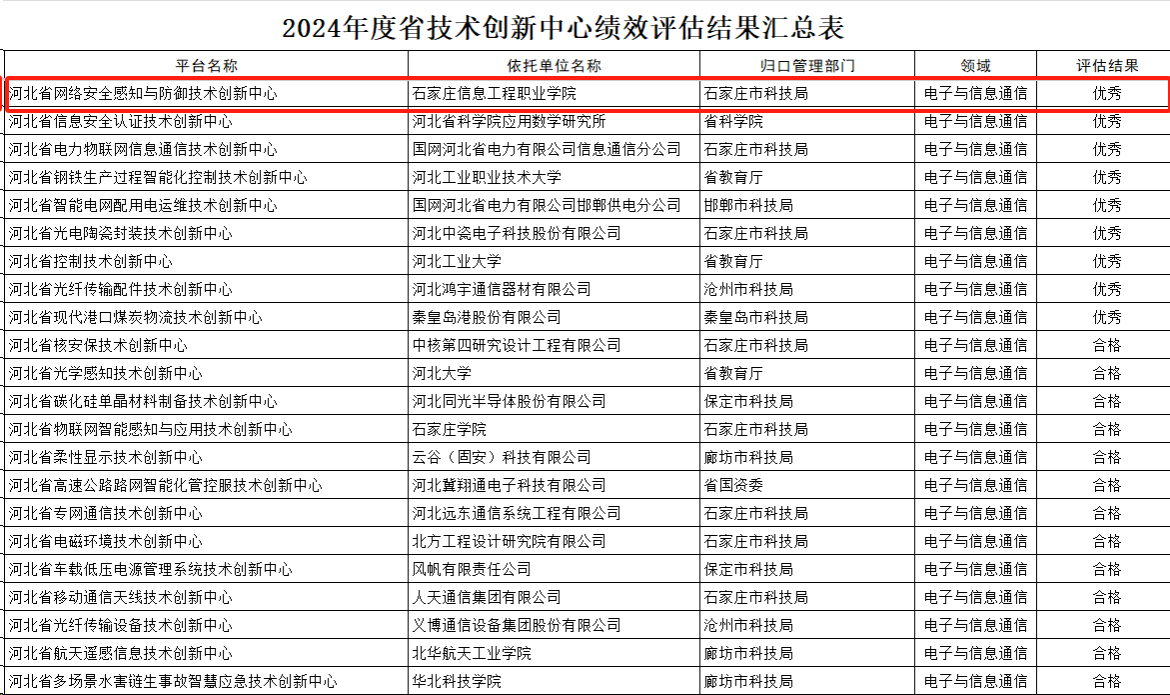 近日,河北省科学技术厅组织开展的2024年度省重点实验室、技术创新中心绩效评估结果公布,beat365官网“河北省网络安全感知与防御技术创新中心”获评优秀。