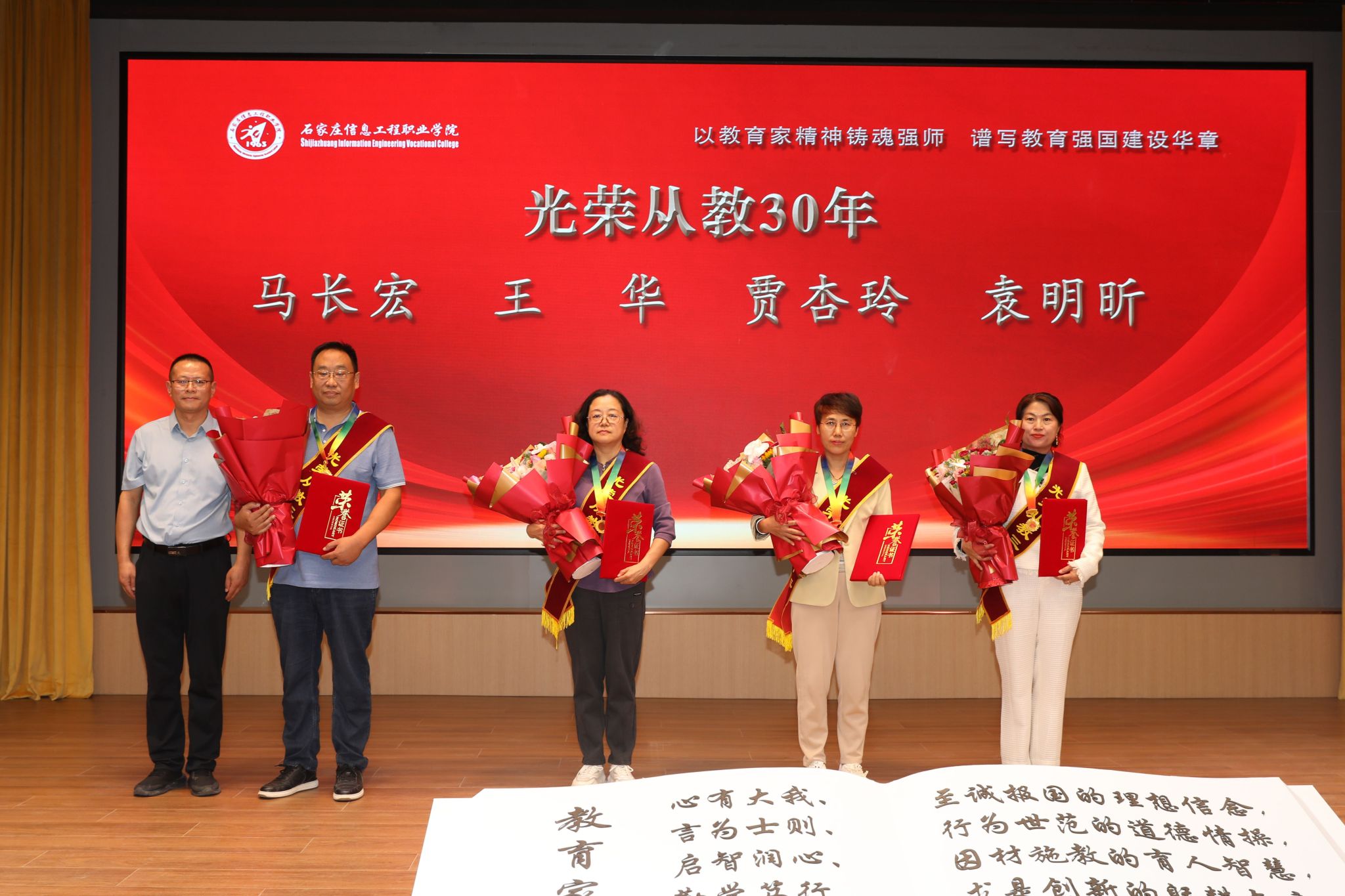 弘扬尊师重教传统,凝聚立德树人力量。大会举行了隆重的表彰仪式,学院领导为“最美教师”和“光荣从教30年”教师颁奖,学生代表为受表彰的教师献花。