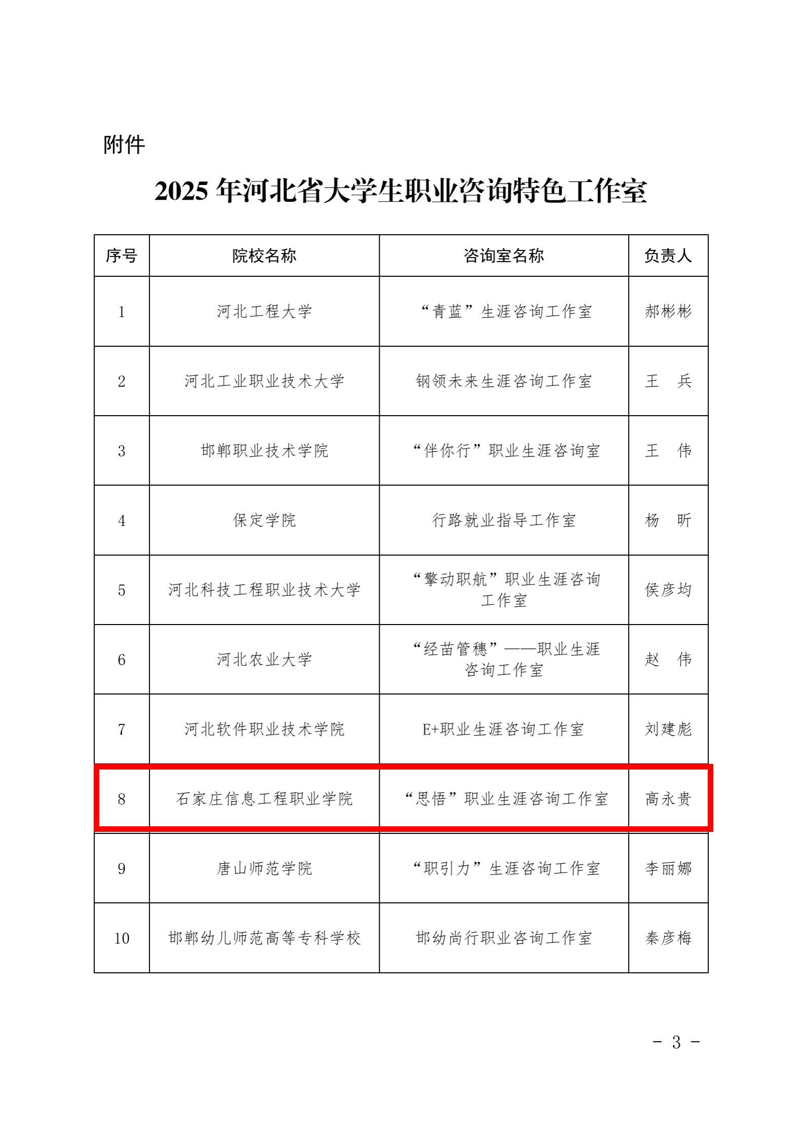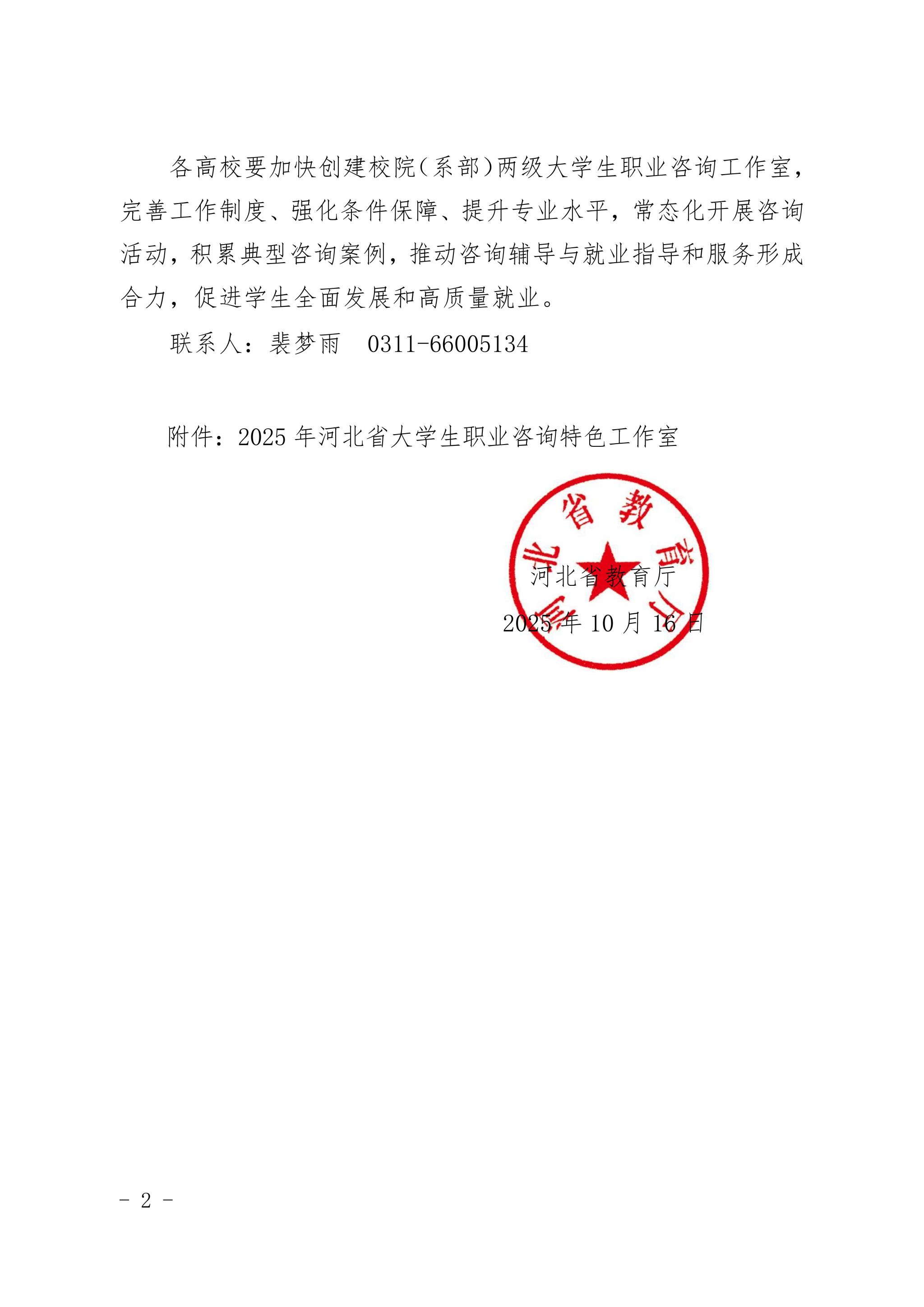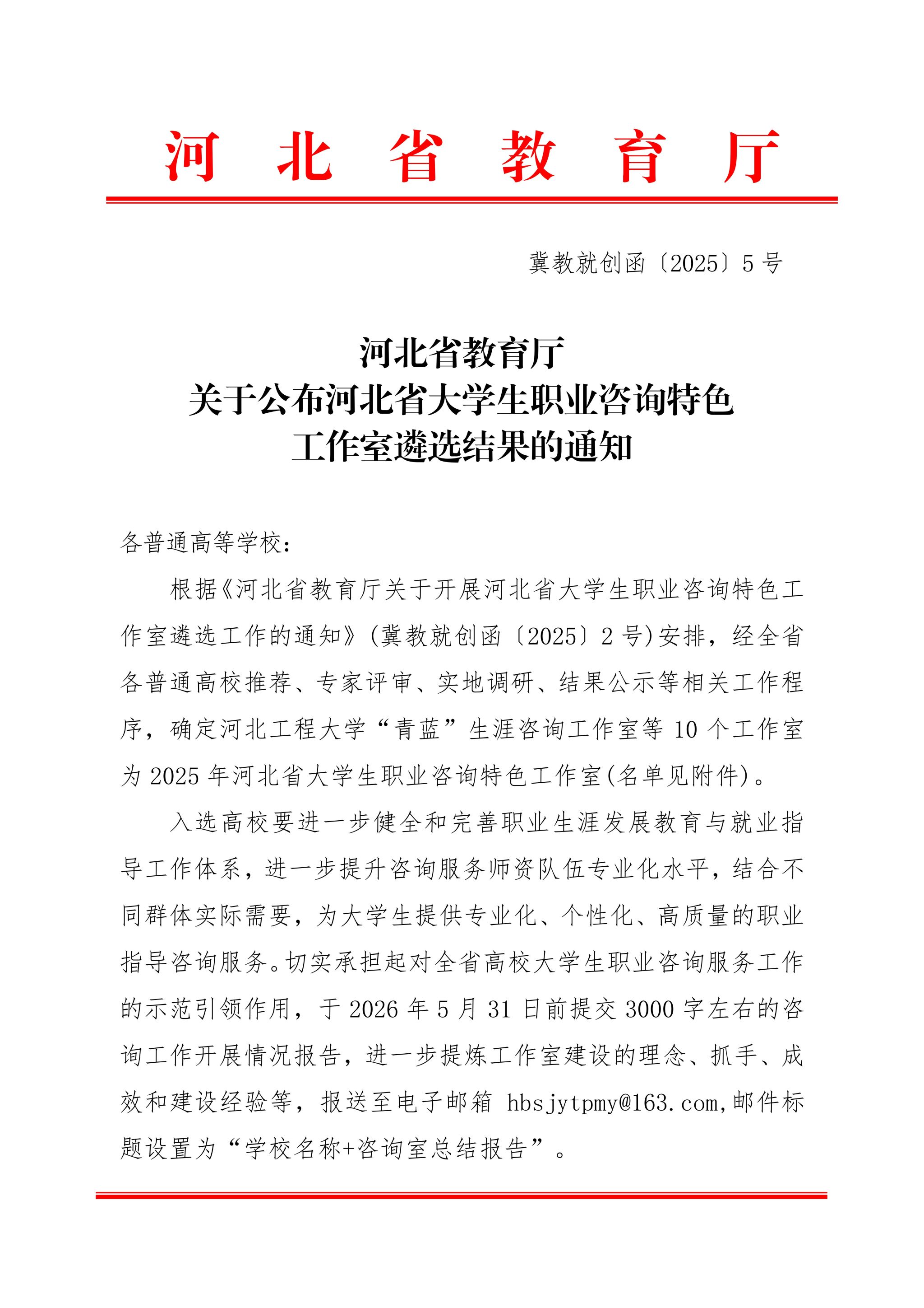 近日,河北省教育厅印发《关于公布河北省大学生职业咨询特色工作室遴选结果的通知》(冀教就创函〔2025〕2号),经高校推荐、专家评审、实地调研、结果公示等多环节严格遴选,beat365官网“思悟”职业生涯咨询工作室成功入选,成为全省10个获此殊荣的大学生职业咨询特色工作室之一,标志着beat365官网职业生涯教育与就业指导工作的专业化、特色化建设获得省级权威认可。