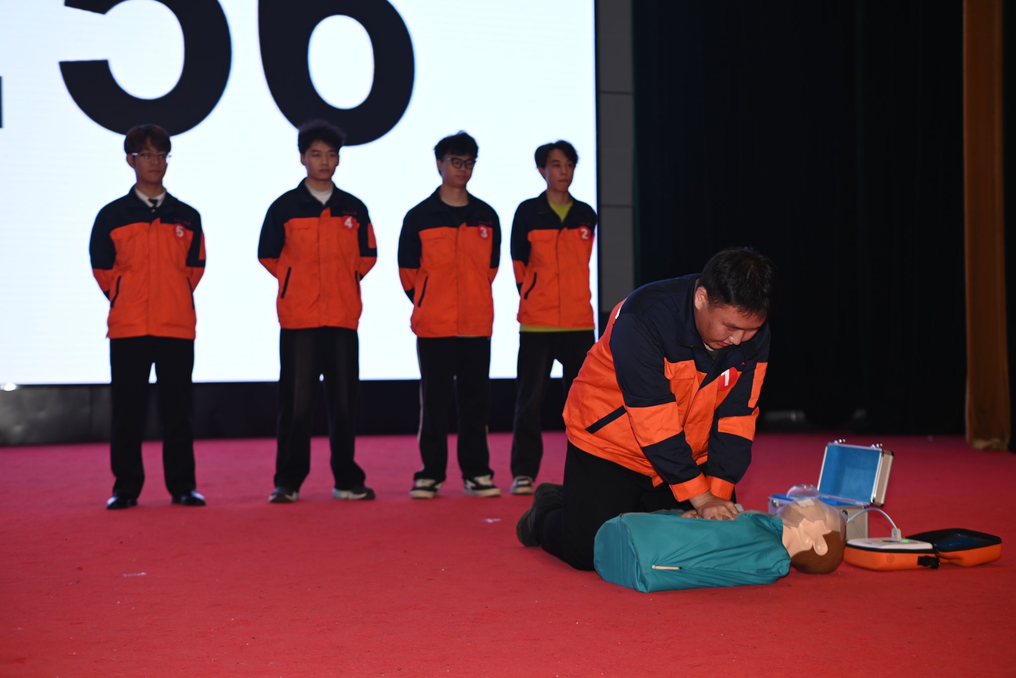 此次比赛分为单项赛与团体表演两个环节。单项赛环节,各队成员依次完成“单人徒手心肺复苏+AED”“三角巾头顶帽式包扎”“左前臂中段骨折”“腹部右侧外伤肠管溢出”“应急救护演讲”五大项目,评委现场打分。单项赛结束后进行团体表演,所有项目完成后公示成绩,并评选出一批单项奖及团体奖。闭幕式上,评委代表上台点评并作总结。