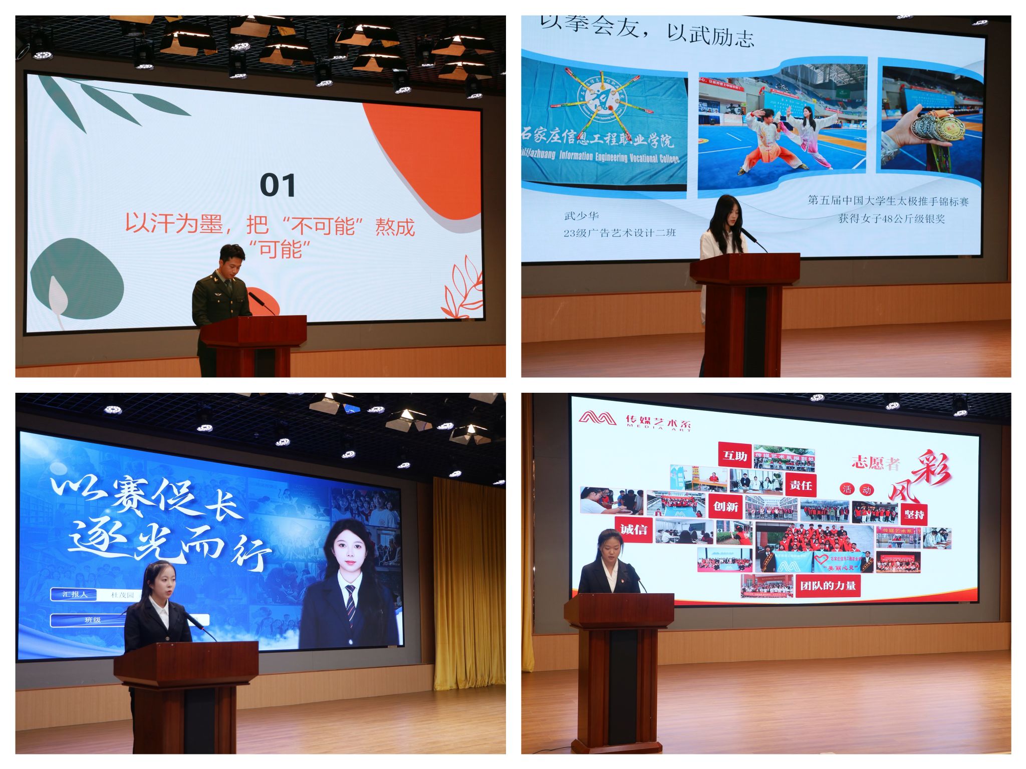 颁奖结束后,四位优秀学子依次进行分享。未腾飞同学分享了五年军旅生涯与省赛夺冠的感悟,传递责任与坚持的力量;杜茂园同学复盘备赛历程,详解如何在挫折中打磨实力;武少华同学以国赛银奖背后的坚守,诠释中华传统文化与拼搏精神的融合;传媒艺术系青协骨干李晓丽同学讲述志愿服务故事,展现青年党员的奉献担当。分享结束后,现场同学积极提问,与学子深入交流,现场活动氛围热烈。