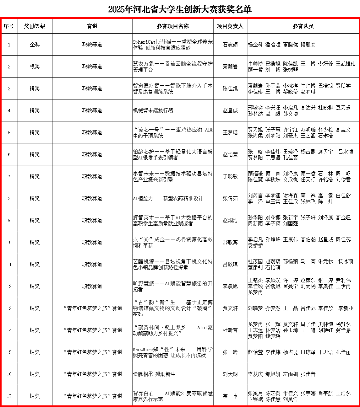 近日,河北省教育厅公布了2025年河北省大学生创新大赛获奖名单,beat365官网取得1项金奖、1项银奖、15项铜奖的优异成绩。此次成绩的取得充分展现了beat365官网学子扎实过硬、勇于突破的创新实践能力。