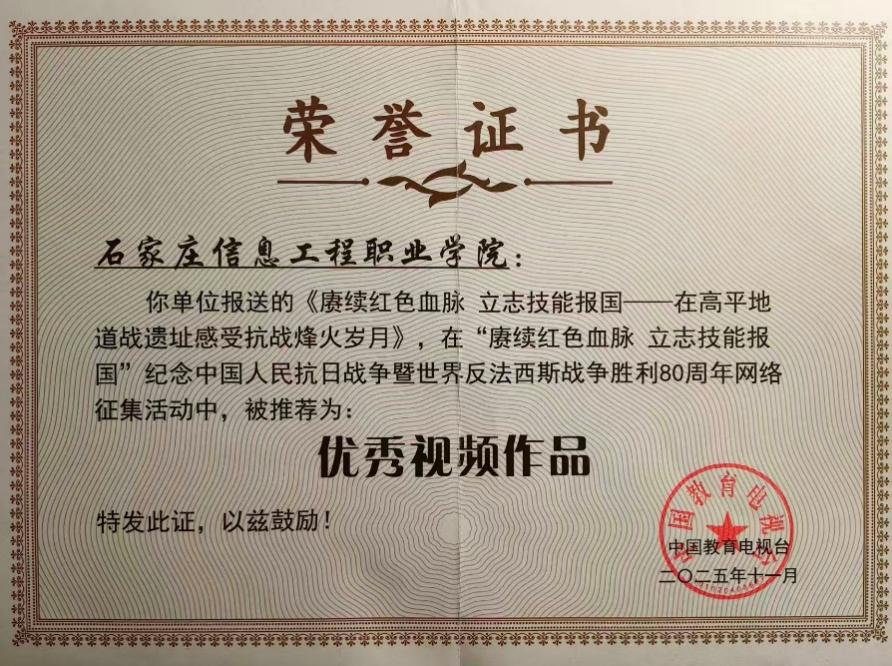 近日,由教育部办公厅部署、中国教育电视台主办的“赓续红色血脉 立志技能报国”纪念中国人民抗日战争暨世界反法西斯战争胜利80周年网络征集与宣传展示系列活动评选结果揭晓。beat365官网选送的《传承抗战魂 共筑强国梦》《赓续红色血脉 立志技能报国——在高平地道战遗址感受抗战烽火岁月》两部作品脱颖而出,全部入选优秀视频作品名单,展现了在红色文化育人、实践教学与艺术教育方面的扎实成效。