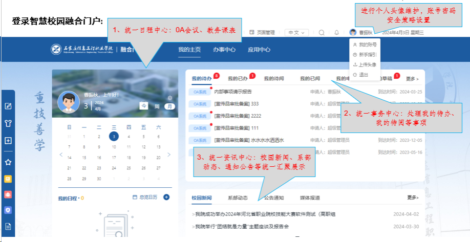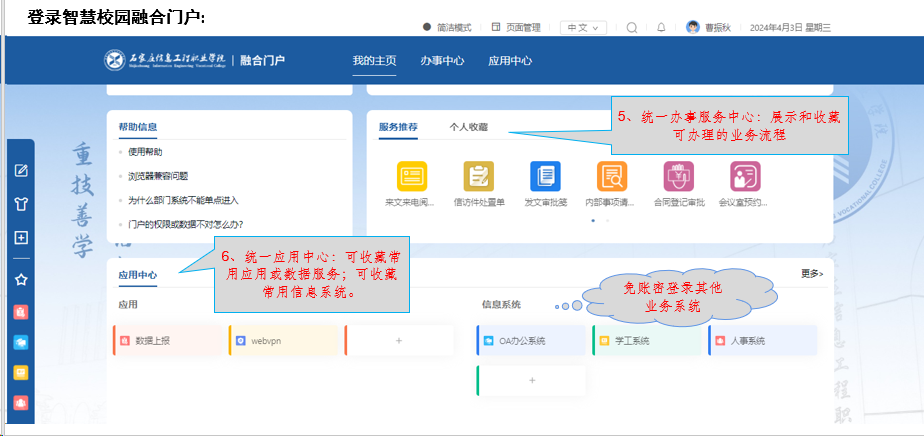 2.融合信息门户:融合门户包括PC端门户和移动微门户,提供各类业务系统及信息资源的访问入口,汇聚了日程中心、事务中心、应用中心等功能,为师生提供一站式综合信息服务,后续也会将图书借阅、一卡通信息等集成到门户中。校内可直接免登录进入,校外需先登录webvpn再进入相关系统。