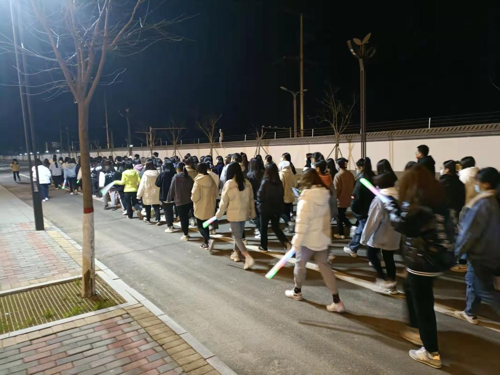 活动以夜跑运动形式开展,得到了同学们的积极响应,纷纷踊跃报名。集合完毕后,同学们手拿荧光棒,排着整齐的队伍,围绕校园进行夜跑,形成了一道璀璨靓丽的风景线,现场气氛活跃。