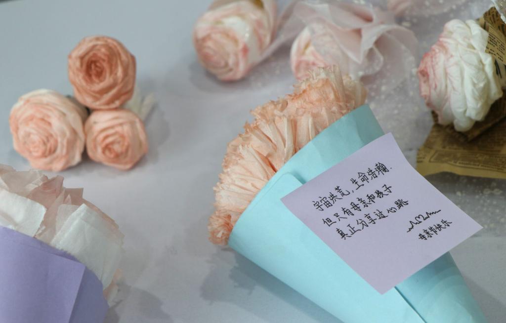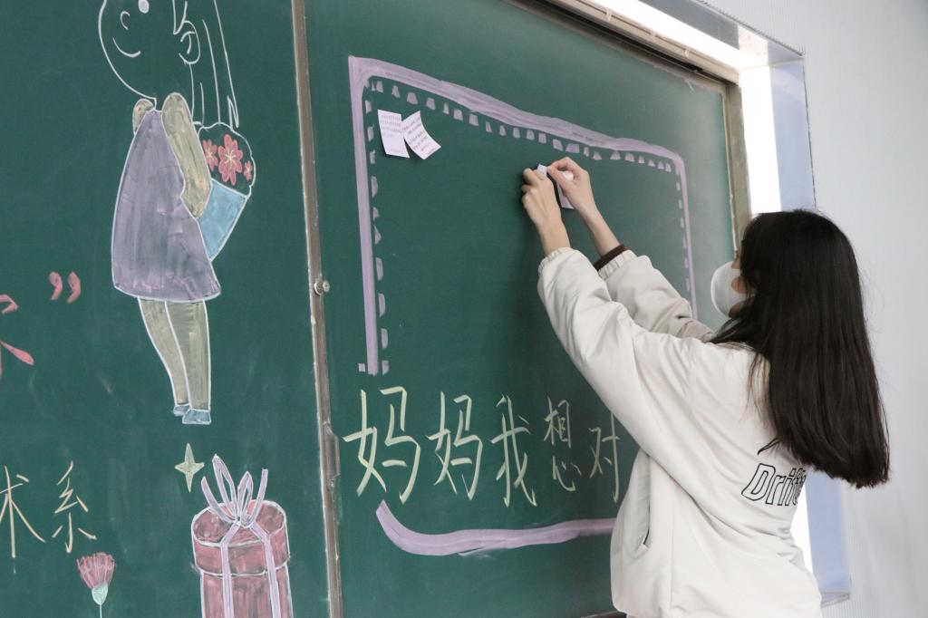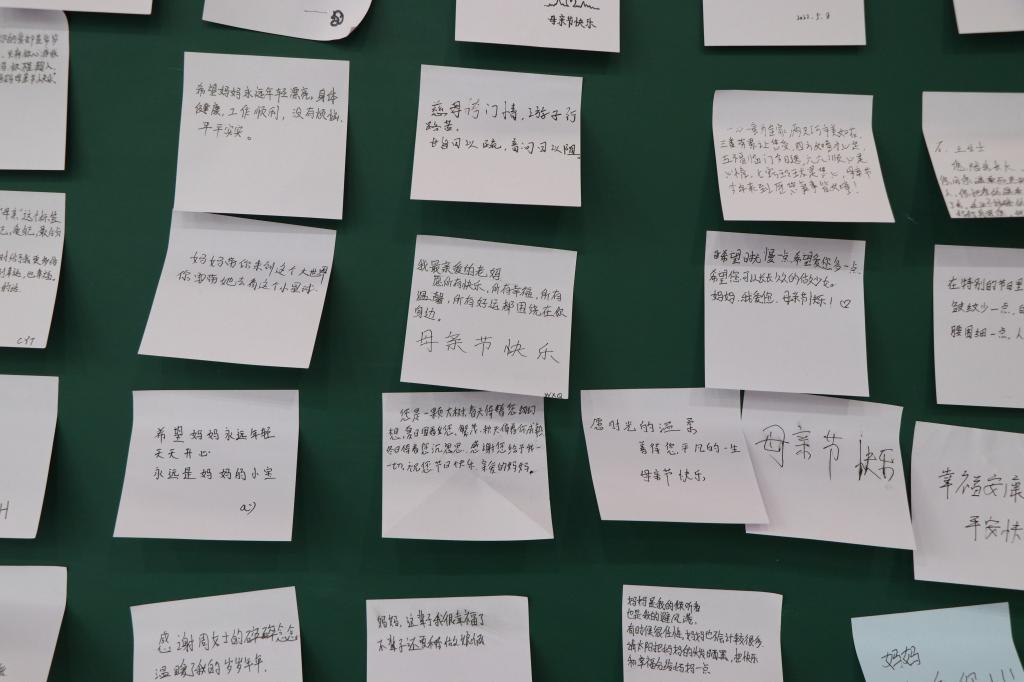 活动现场,同学用卡片亲手为母亲折叠花束,一朵朵花束倾注着对母亲的爱。随后,同学们在便利贴上写下对母亲的感谢与祝福,把朴素的言语化为温馨的行动,传送最真挚的感情。最后,同学们将自己的“祝福”贴到黑板上,大胆地向妈妈展示爱。