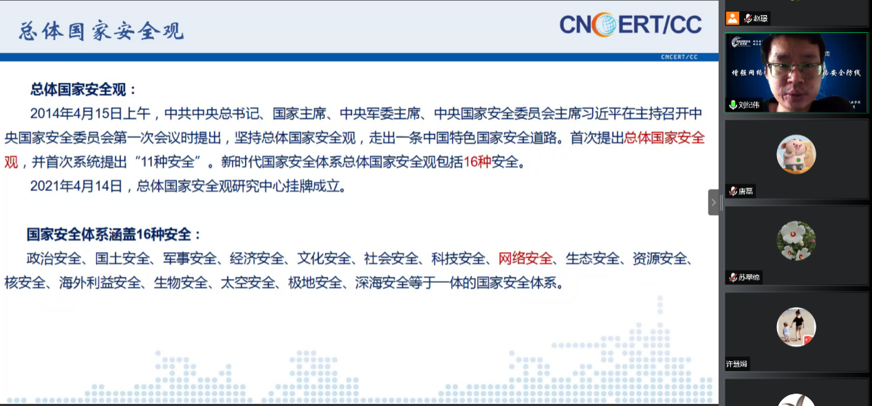 9月9日,网络与通信工程系特邀国家计算机网络与信息安全管理中心河北分中心高级工程师刘纪伟,开展以“增强网络安全意识,共筑网络安全防线”的线上专题讲座,围绕习近平总书记提出的“没有网络安全就没有国家安全”的论述,站在国家安全的高度,结合实际案例为广大师生强化了网络安全的宏观概念。