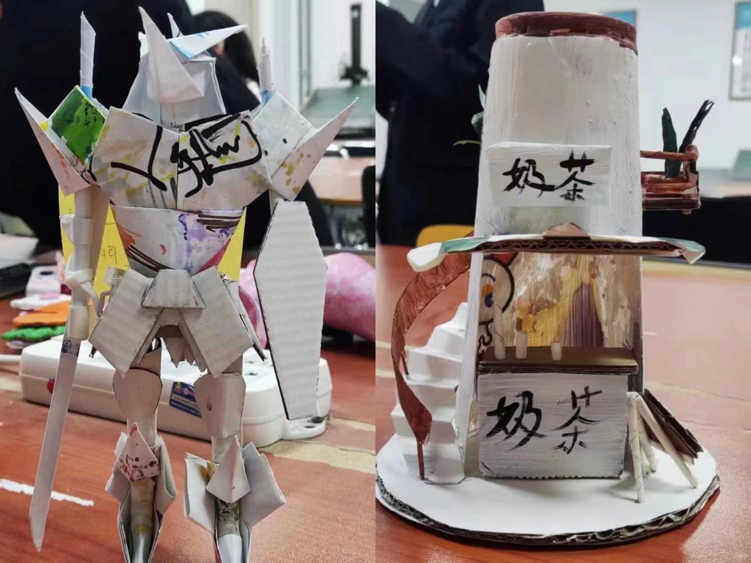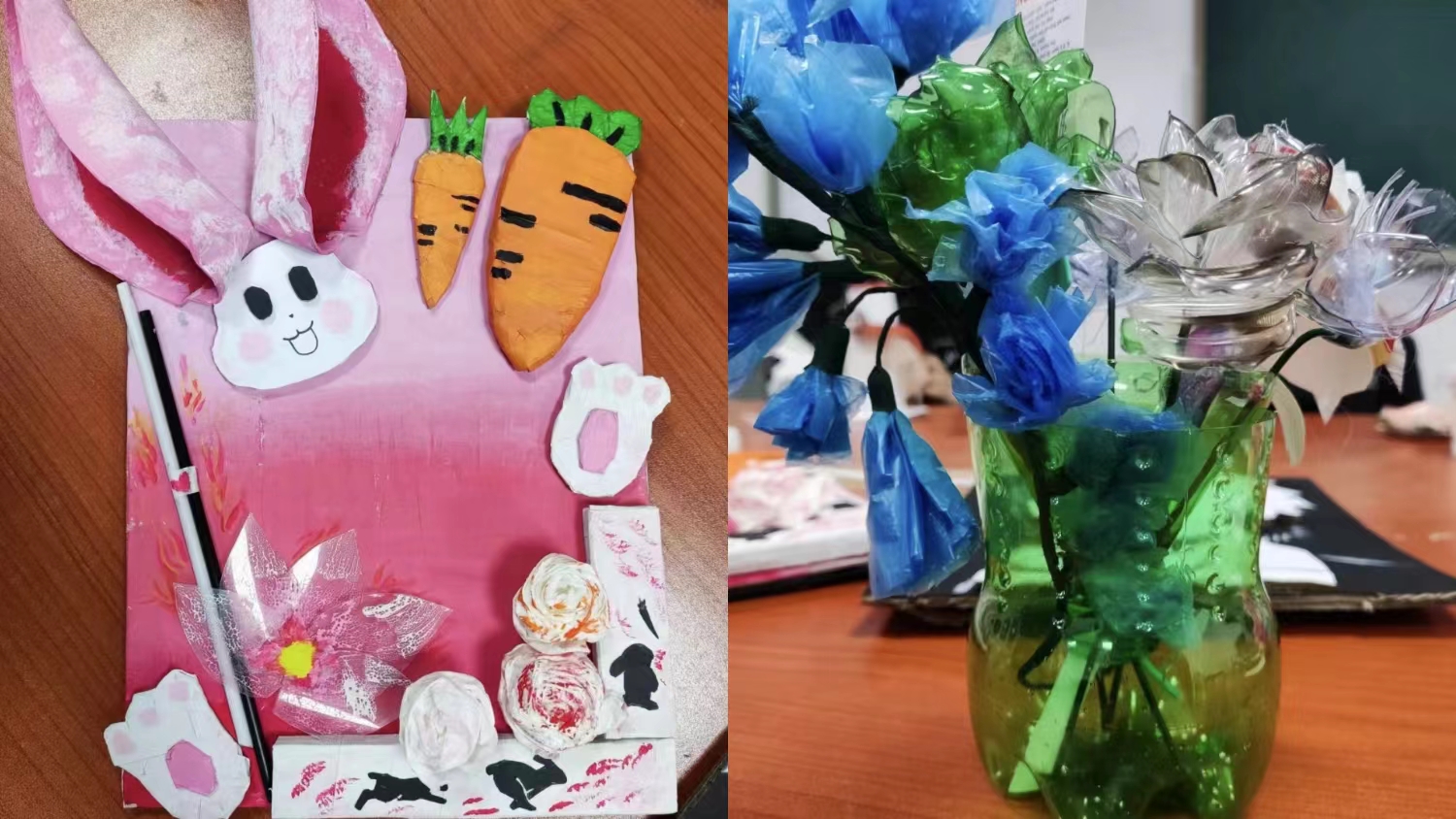 在知新8号楼315教室,同学们开展 “变废为宝”手工制作活动,同学们积极参与,亲自动手改造废旧物品,有的同学利用废旧纸张、纸盒做成卡通模型,装饰品;有的同学利用塑料袋、饮料瓶做成手工花束;有的同学拿出闲置的衣服,浇上喜欢的颜料,扎染成新衣裳。根据同学们的作品,最终评选出了一二三等奖项。