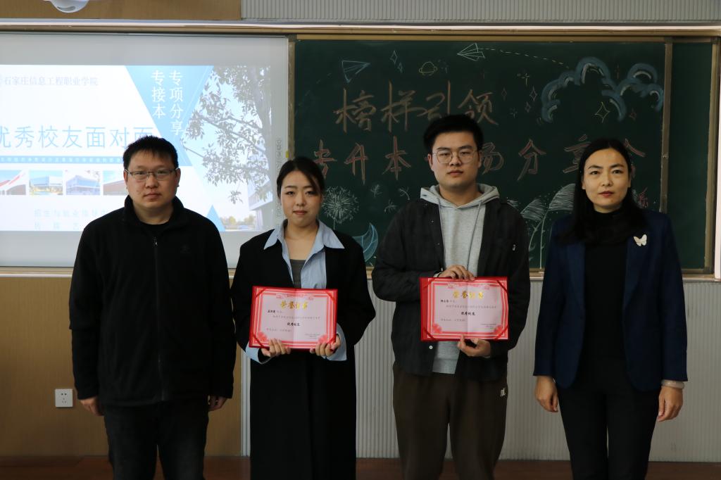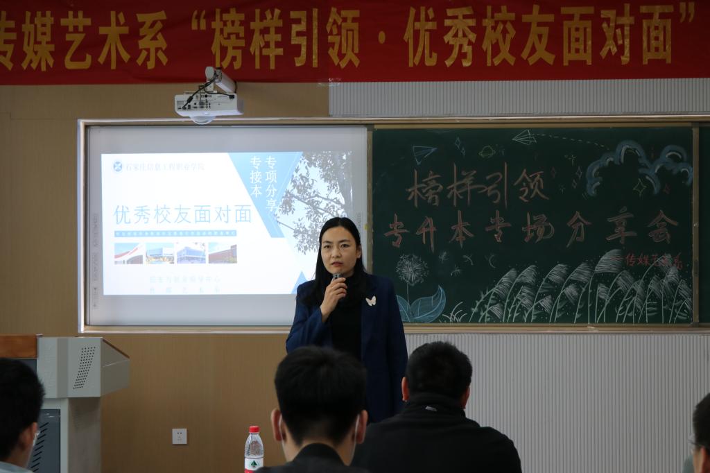 传媒艺术系党总支书记张婷首先向两位优秀校友的到来表示欢迎,并鼓励同学们向优秀校友看齐,树立目标,做好规划,坚定信心,踏实学习,朝着自己的目标不断努力。随后,传媒艺术系负责人为两位同学颁发了优秀校友荣誉证书。