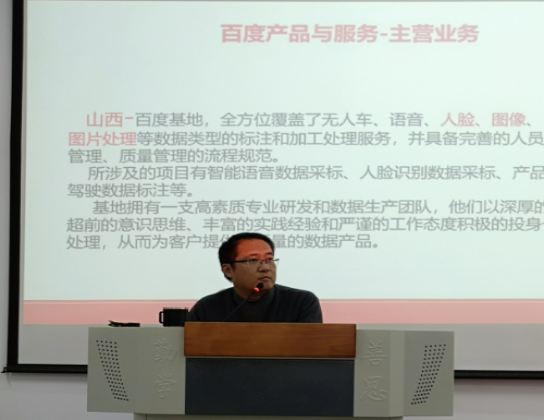会上,山西节南山网络科技有限公司代表蔡亮就公司的规模以及依托百度数据基地为基础所需要的招聘岗位、薪资福利、招聘条件、行业未来发展等方面进行了全方位介绍,并表示公司高度重视高校毕业生的创新意识和开拓精神,欢迎有志于从事软件数据技术等领域的高校毕业生积极加入。