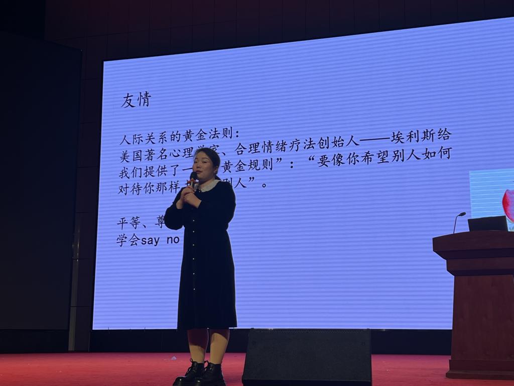 冯娅惠以“走进自我、关爱自我、接纳自我”为题,围绕作为一名女性,如何更好地认识自我、关爱自我这个主题,从亲情、友情、爱情三个方面进行了精彩的讲述,通过生动的案例和实践操作,向在场的女同学传授了如何调整心态、增强自我认知、培养健康的生活习惯等实用技巧和方法。讲座现场气氛热烈,同学们积极参与互动,纷纷表示通过此次讲座,不仅加深了对心理健康的认识,还学到了很多实用的心理调适技巧和方法。她们表示,将在未来的学习和生活中,更加注重自己的心理健康,积极寻求自我成长和发展的机会。