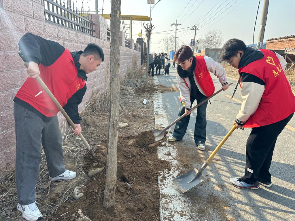 3月12日上午,三邱村村南路,志愿者们身穿红马甲,和附近村民共同组成植树队伍。大家三五一组,扶苗填坑、挥锹培土、踩实松土、拍平围埝……每一个环节都分工明确,配合默契,现场呈现出一派热火朝天的景象。经过一上午的辛勤付出,100棵国槐在微风中展现出勃勃生机,为裸露的土地披上一件“新衣”。