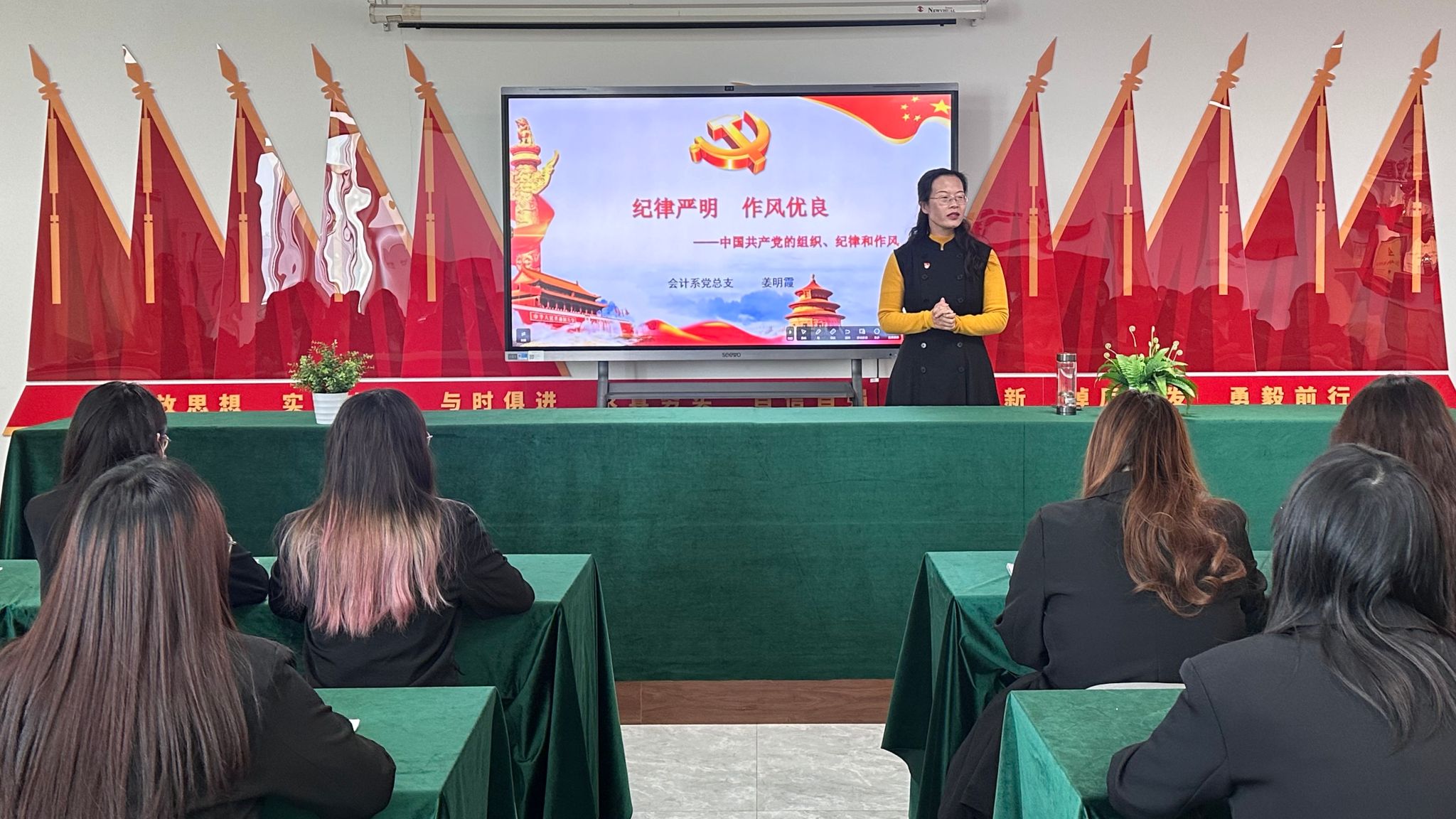 3月22日,会计系副主任姜明带领全体同学了解学习中国共产党的组织、纪律和作风。她指出,没有共产党就没有新中国,只有社会主义才能救中国,只有改革开放才能发展中国、发展社会主义、发展马克思主义,只有中国共产党才是中国特色社会主义事业的坚强领导核心。