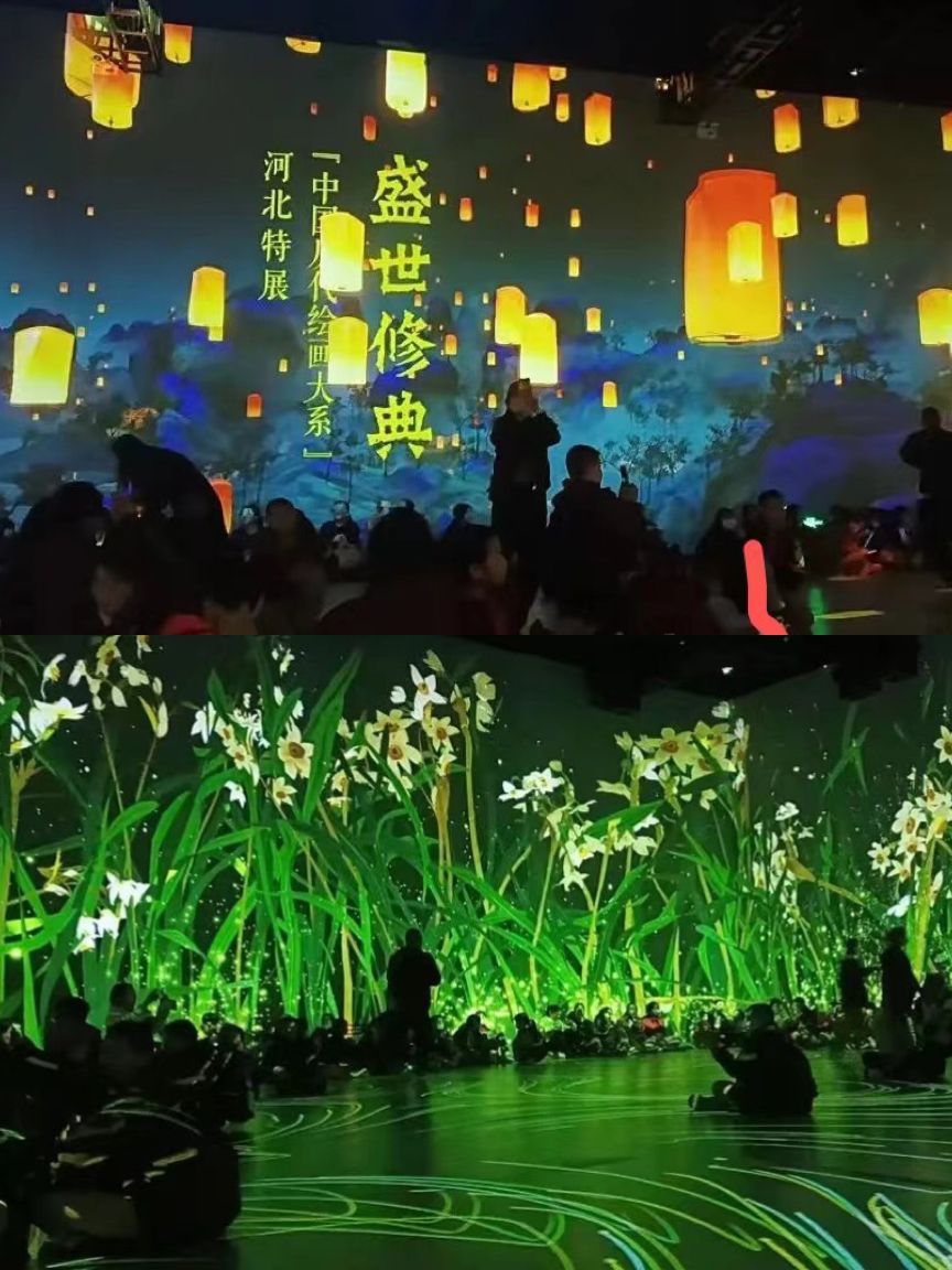 走出展厅,大家来到“盛世修典——‘中国历代绘画大系’河北特展”的现场,一幅幅精美的画作映入眼帘,大家纷纷被这些艺术瑰宝所展现的独特魅力和深厚底蕴所折服,频频发出赞叹,心中油然升起自豪感。来到“光影丹青”沉浸式体验区,通过视、听、触多感官的交互,身临其境的体验,大家在古画中感受到了美,感受到中华优秀传文化深厚的魅力。