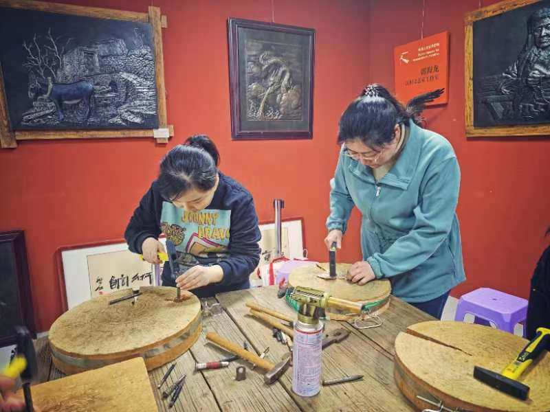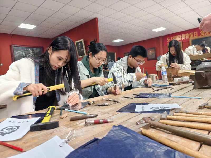 活动中,师生们体验了铜树叶、羽毛书签和浮雕画的制作流程。一块铜板,经过同学们的敲敲打打,很快就变成了色彩斑斓、惟妙惟肖的工艺品。