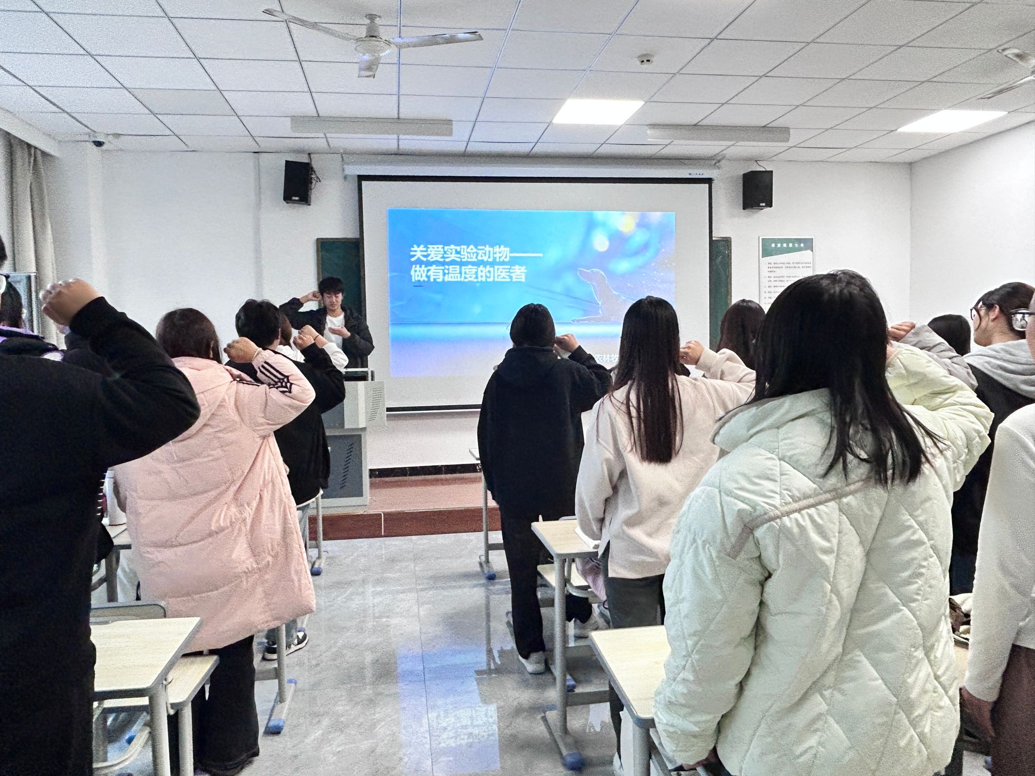 科普讲解环时,指导老师基于专业科学知识,围绕常见动物医学疾病发病机制、治疗手段、预防措施、急救护理、临床用药等医学内容进行科普,用通俗易懂的语言激发学生的学习兴趣,扩展学生们的知识视野。在猜谜活动中,抢猜谜、兑换奖品,同学们不亦乐乎。一条条妙趣横生的谜语让大家产生了浓厚的兴趣,你一言我一语沉浸在活动的喜悦中。同学们还进行医学人文宣誓,对为人类科学发展贡献出宝贵生命的实验动物进行默哀,并在“关爱实验动物——做有温度的医者”条幅上签名。