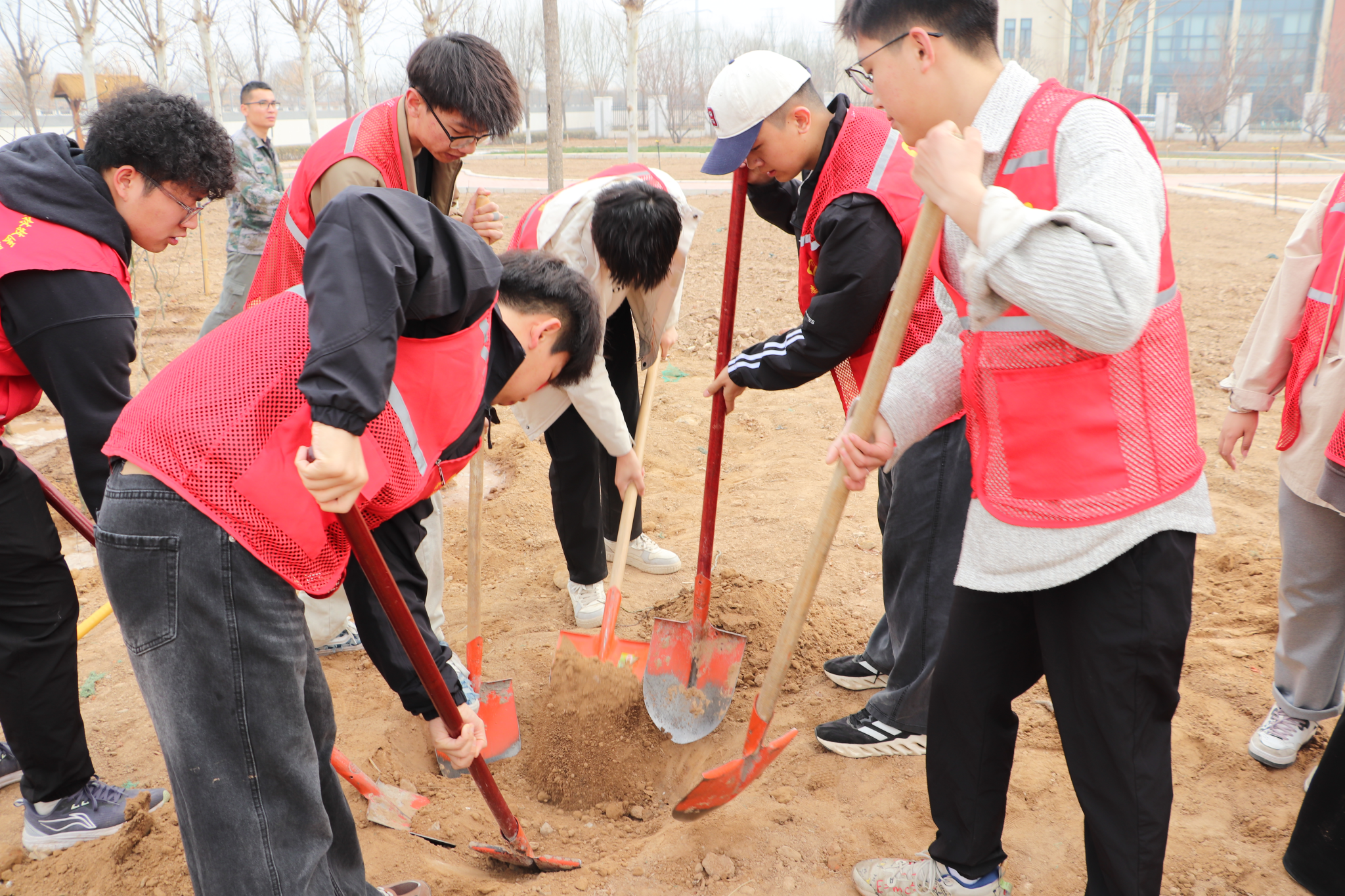植树现场,师生们热情高涨,迅速分成小组,投入到义务植树的火热劳动中。他们有的挥锹铲土,有的扶苗种树,有的铲土培实,有的提桶浇水……大家分工井然,配合默契,各环节衔接流畅,齐心协力将一棵棵龙柳树苗精心栽植于土壤之中。