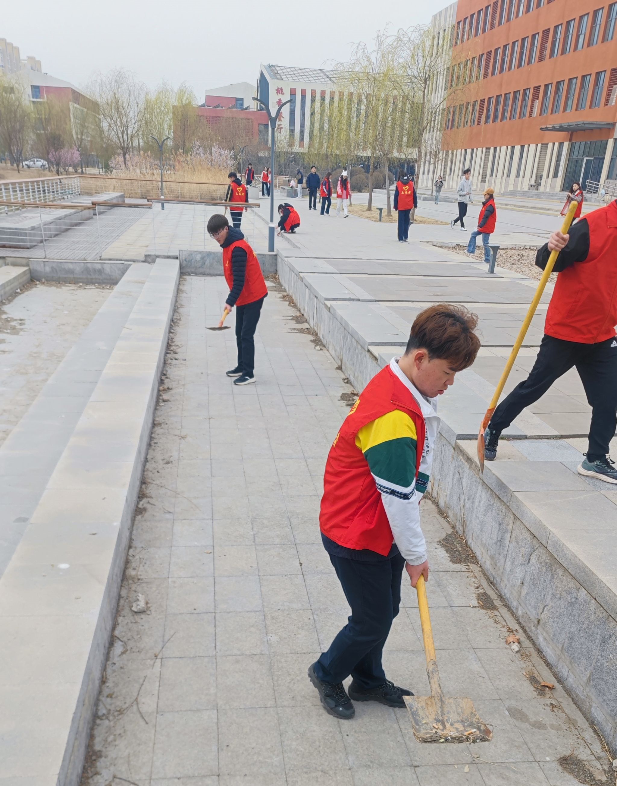 志愿者们身穿红色马甲,手持清扫工具,全身心投入到清洁工作中。他们两人一组或三五成群,沿着知海湖边仔细搜寻隐匿在草丛和石缝中的各种垃圾,全然不顾脏污,用工具或是徒手将垃圾捡起并收集到附近的垃圾桶内。活动过程中,尽管天气寒冷,但同学们齐心协力,相互配合,用汗水换来了知海湖边环境卫生的进一步改善。