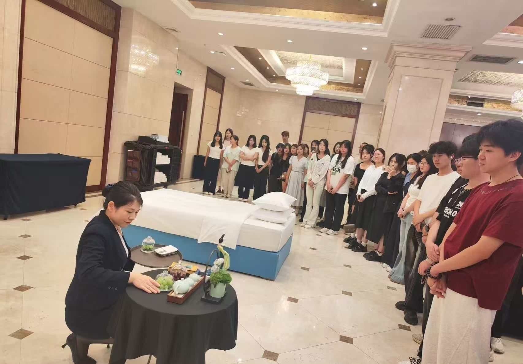 曾在全国酒店服务技能大赛中获得客房组金奖的河北云瑧世纪大饭店员工登台展示。她以良好的精神面貌、标准化的中式铺床、独特的客房主题创意等高超技能,赢得了同学们的掌声。同学们近距离观摩行业高手的操作,纷纷表示深受震撼,更加坚定了提升专业技能的决心。