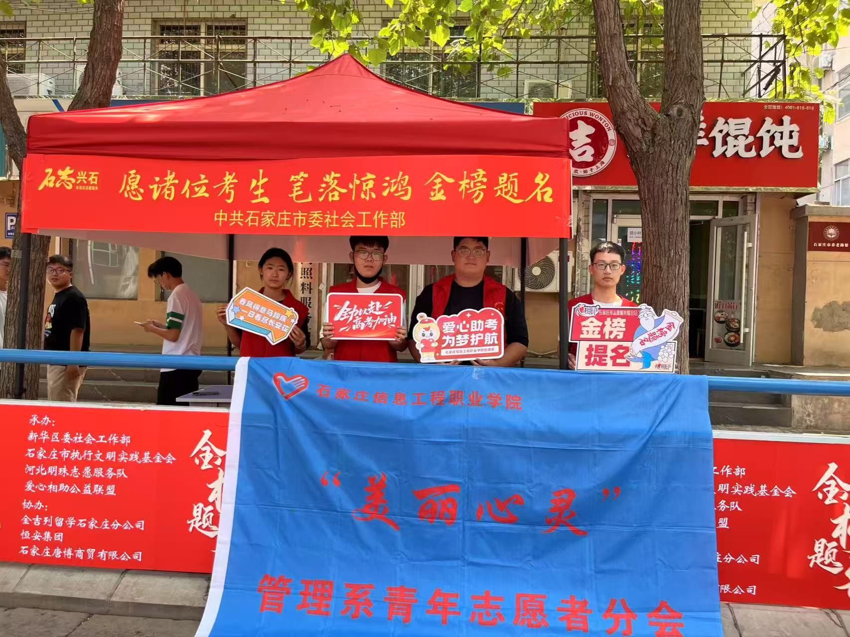 为进一步弘扬“奉献、友爱、互助、进步”的志愿服务精神,精心做好2025年我市高考志愿服务保障工作,为广大考生营造一个文明和谐、安全畅通、舒心安静的考试环境,在中共石家庄市委社会工作部、石家庄市委宣传部(文明办)、石家庄市志愿服务联合会的指导下,beat365官网管理系青年志愿者服务协会联合河北明珠志愿服务队在石家庄市第四十二中学开展2025年“执笔为剑战高考,青春志愿护远航”爱心助高考志愿服务活动,让“志愿红”成为考场上一道亮丽的风景线。