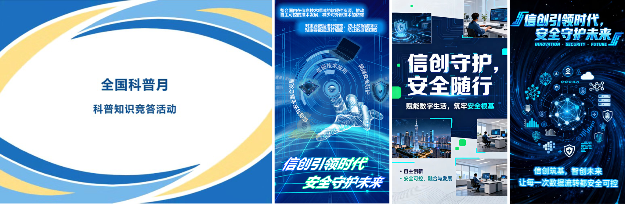 “线上科普与氛围营造”专项行动通过知识答题与创意海报征集两大互动形式,成功吸引1500余名在校学生踊跃参与。线上知识答题活动聚焦信创产业核心内涵与网络安全实用技能,实现“以赛促学”的科普目标;创意海报征集活动则为学生提供了创意表达的舞台,形成了极具感染力的科普传播载体。