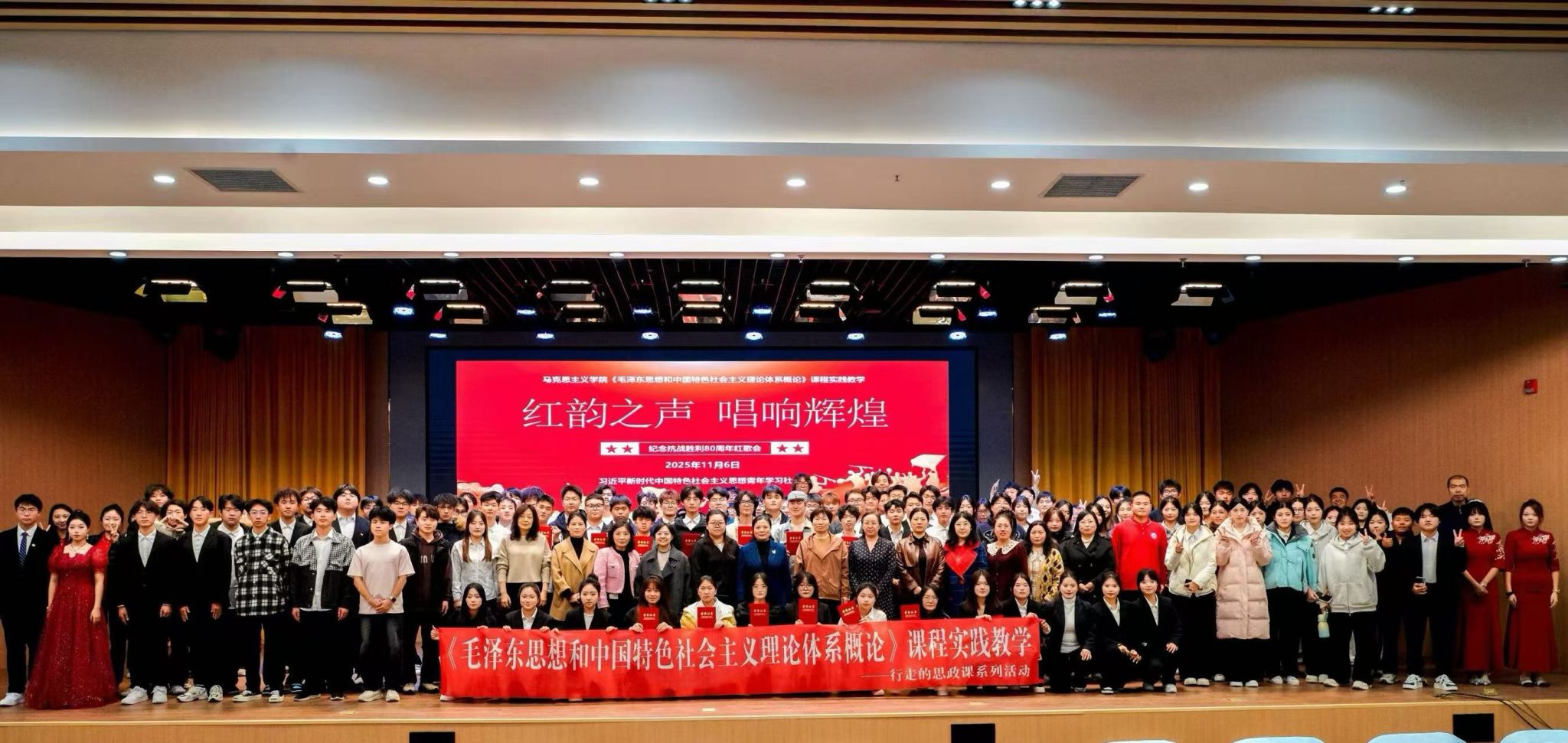 11月6日下午,由马克思主义学院主办、习近平新时代中国特色社会主义思想青年学习社组织承办的纪念抗战胜利80周年暨《毛泽东思想和中国特色社会主义理论体系概论》课程实践教学红歌会在图书馆一楼报告厅举行。本次红歌会是第二届面向全体2024级学生的比赛,也是《毛泽东思想和中国特色社会主义理论体系概论》课程多年来持续进行教学改革与创新的实践教学活动。经过任课教师班级的初赛,最终推选出17支决赛队伍,来自学院10个系约240余人同台唱响红歌,歌唱对祖国的热爱!