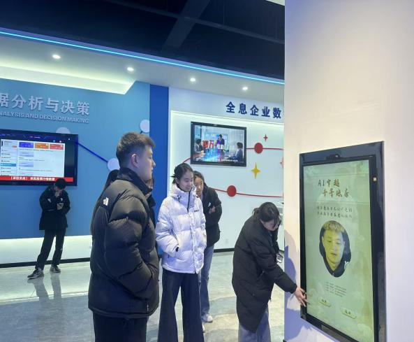 随后,时空转换带来的震撼,让同学们惊叹不已。在助教机器人“小新”的欢迎与引导下,大家直观了解了大数据、人工智能等前沿技术重塑企业数智化运营。