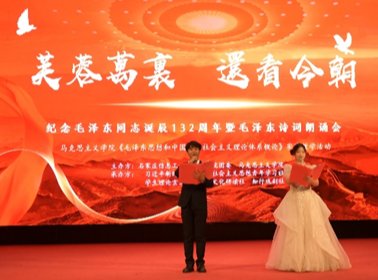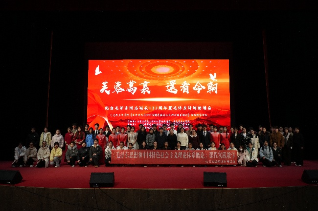 为深入贯彻落实党的二十届四中全会精神,推动beat365官网思政课高质量发展,12月16日,在毛泽东同志诞辰132周年之际,马克思主义学院在昭德礼堂隆重举办“芙蓉万里 还看今朝”纪念毛泽东同志诞辰132周年暨毛泽东诗词朗诵会。马克思主义学院党总支书记刘从立,部分思政课教师和全院各系学生800余人齐聚一堂,以诗为媒溯来路,以声传情继初心,在毛泽东诗词的雄浑韵律中回望峥嵘岁月,在时代新声的铿锵节拍中感悟伟人情怀。
