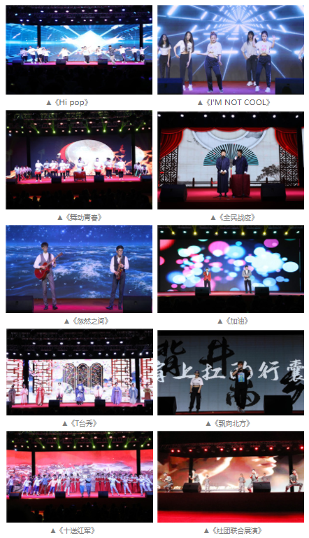 长城网讯(吴培培 陈旭超)6月13日晚,石家庄信息工程学院第十八届大学生艺术节闭幕式暨“百年风华 青春与党同行”庆祝中国共产党成立100周年文艺汇演在自强操场成功举办。学院领导马文刚、陈宗良、赵伟、黄淑敏、刘占红、赵惠娟、王志明与师生共同观看。   陈宗良代表学院党委向本届艺术节的成功举办及在艺术节中取得优异成绩的集体和个人表示祝贺,向为本次艺术节付出辛勤劳动的老师和同学们表示诚挚的感谢。他指出,本届大学生艺术节紧紧围绕庆祝建党100周年,在历时一个多月的时间里,组织了党史知识竞赛、青春诗会、校园明星主持人大赛等系列活动,进一步带动了全院师生开展校园文化活动的热情,展示了广大师生良好的艺术才华和精神风貌,营造了健康向上、高雅文明的校园文化氛围,激发了广大师生爱党爱国爱校的真挚感情。 “穿越百年沧桑读你的容颜,读你初心不改的诗篇,打开百年长卷读你的伟岸,读你红旗漫卷的烂漫……”,一曲原创歌伴舞《读你》拉开文艺汇演序幕,在回望百年党史中读懂共产党人的初心和使命,在坚定追随中读懂新时代青年的责任与担当。  ▲《读你》 “唱支山歌给党听,我把党来比母亲……”“我和我的祖国,一刻也不能分割……”“我们都是追梦人,千山万水,奔向天地跑道……”,熟悉而又经典的旋律串起了《歌声中的党史》,抒发了对党对祖国的无限深情与眷恋,唱出了青年一代在努力奔跑中拥抱梦想的信心与喜悦。  ▲《歌声中的党史》 现代舞《Hi pop》《I'M NOT COOL》活力四射,青春跃动,跳出了自我,跳出了快乐。战鼓表演《舞动青春》雄壮威武,气势磅礴,鼓点紧凑,传递出催征上阵的浩然正气,昂扬士气。相声《全民战疫》再现了疫情面前中国特色社会主义制度的优越性和身为中国人的骄傲与自豪。萨克斯与贝斯合奏的《忽然之间》美妙动听、回味悠长。歌曲《加油》呈现了积极向上的人生态度。T台秀将华丽的汉服、优雅的旗袍和端庄的职业装融为一体,上演了一场穿越古今,融汇传统与时尚的服饰秀。说唱《飘向北方》唱出了青年一代为梦想而奋斗的心声以及对未来的无限期待与向往。音乐剧《十送红军》再现了长征时期红军战士用生命守护和传递星星之火的感人故事。汉服社、国防教育连和跆拳道社带来的联合展演时而翩翩起舞,时而英武雄壮,时而掷地有声。