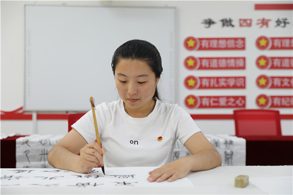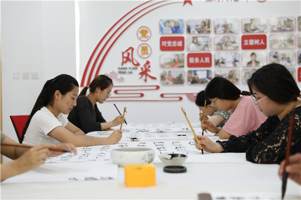 “为了让党史学习教育更加深入人心,我们充分发挥专业优势,通过浓墨重彩写党史、精雕细琢刻党史、经典吟诵唱党史、声情并茂说党史,使广大师生在心动中行动,在行动中感动。”传媒艺术系副书记魏冬拿起一幅刚刚完成的《七律·长征》说。 风雨送春归,飞雪迎春到。已是悬崖百丈冰,犹有花枝俏。2019级书法班学生李亚娜一笔一划间流露着真情与豪迈。