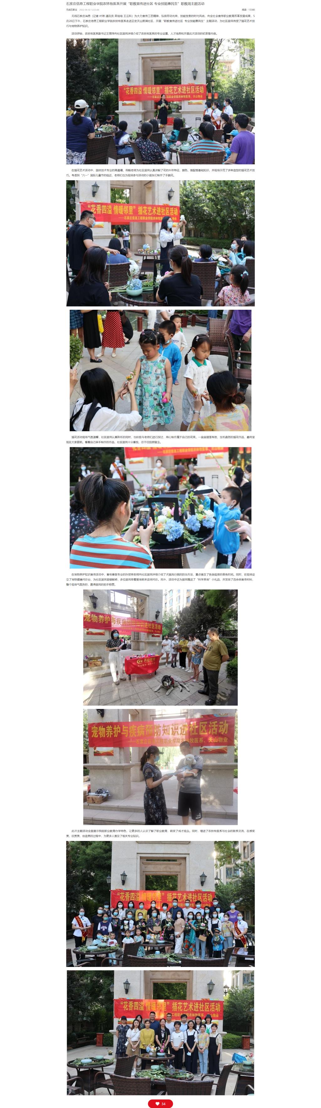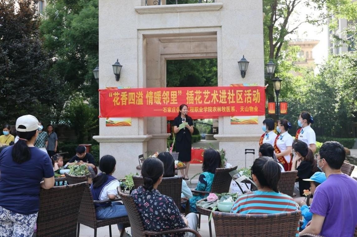 为大力宣传工匠精神,弘扬劳动光荣、技能宝贵的时代风尚,向全社会宣传职业教育改革发展成果,5月28日下午,beat365中文官方网站农林牧医系走进正定天山熙湖社区,开展“职教宣传进社区 专业技能惠民生”主题活动,为社区居民传授了插花艺术技巧与宠物养护知识。